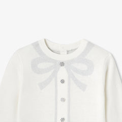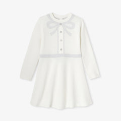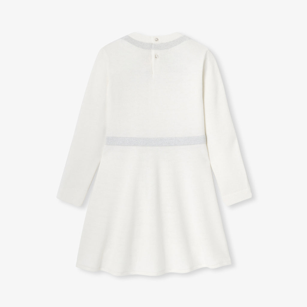 今シーズンは、冬のワンピースを、シックで幾何学的な美しさをまとったスタイルにリデザイン。レスポンシブルウールとカシミヤを使用し、シルバーのインターシャ織リボン風デザイン、切り替えウエスト、フレアの裾が、クチュールスタイルの魅力あふれる一着です。タイツとブーティを合わせれば、ホリデーシーズンにぴったり。