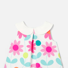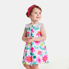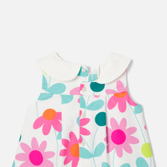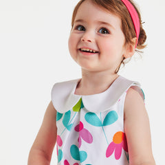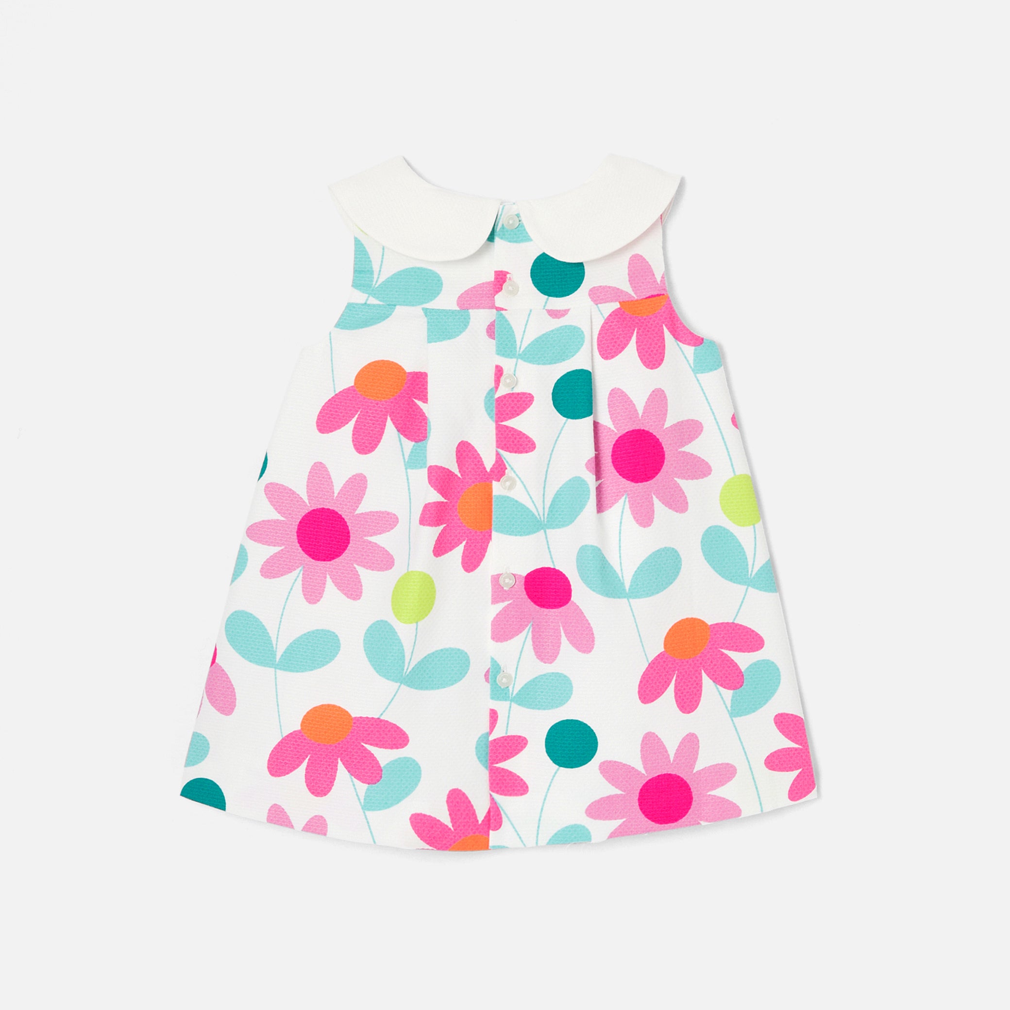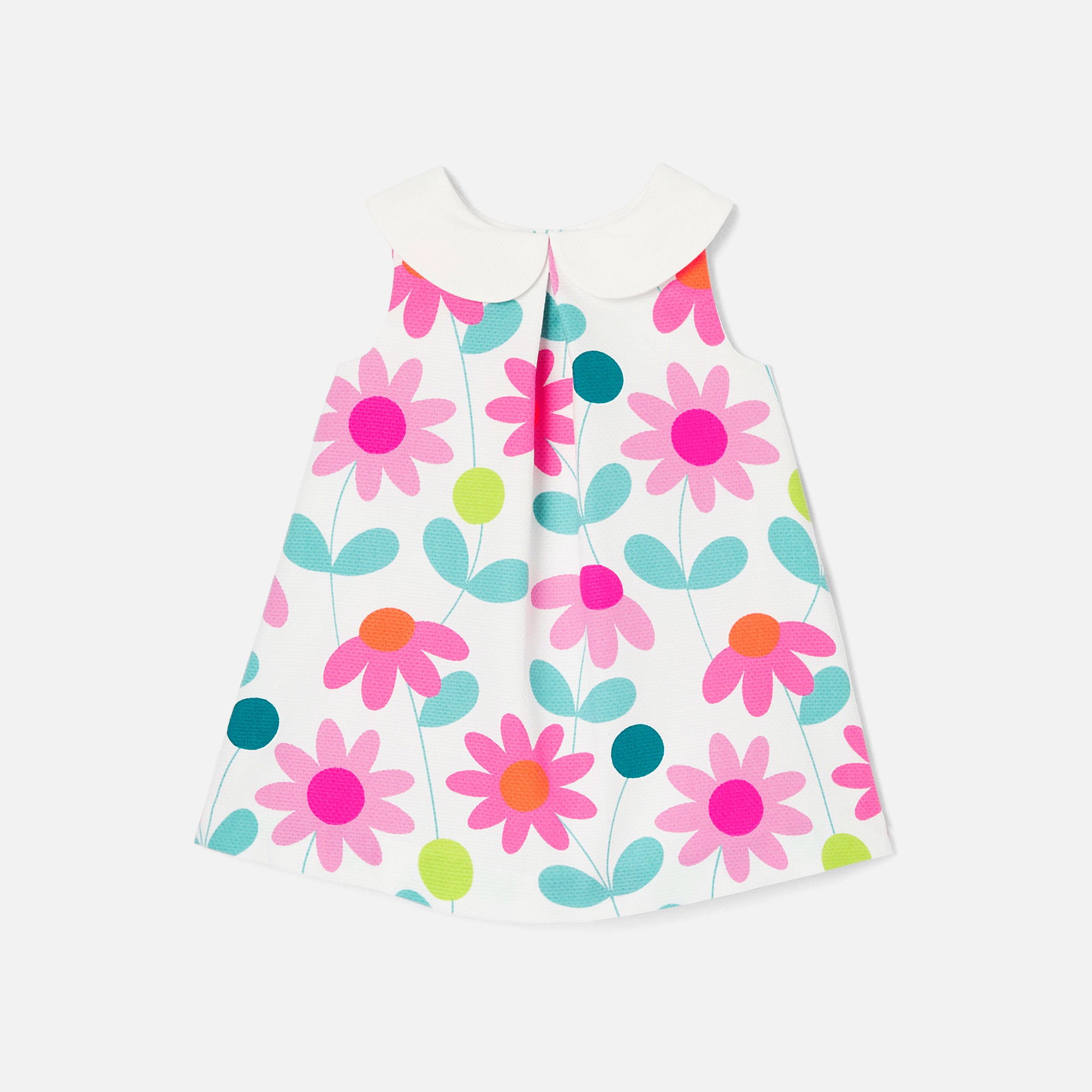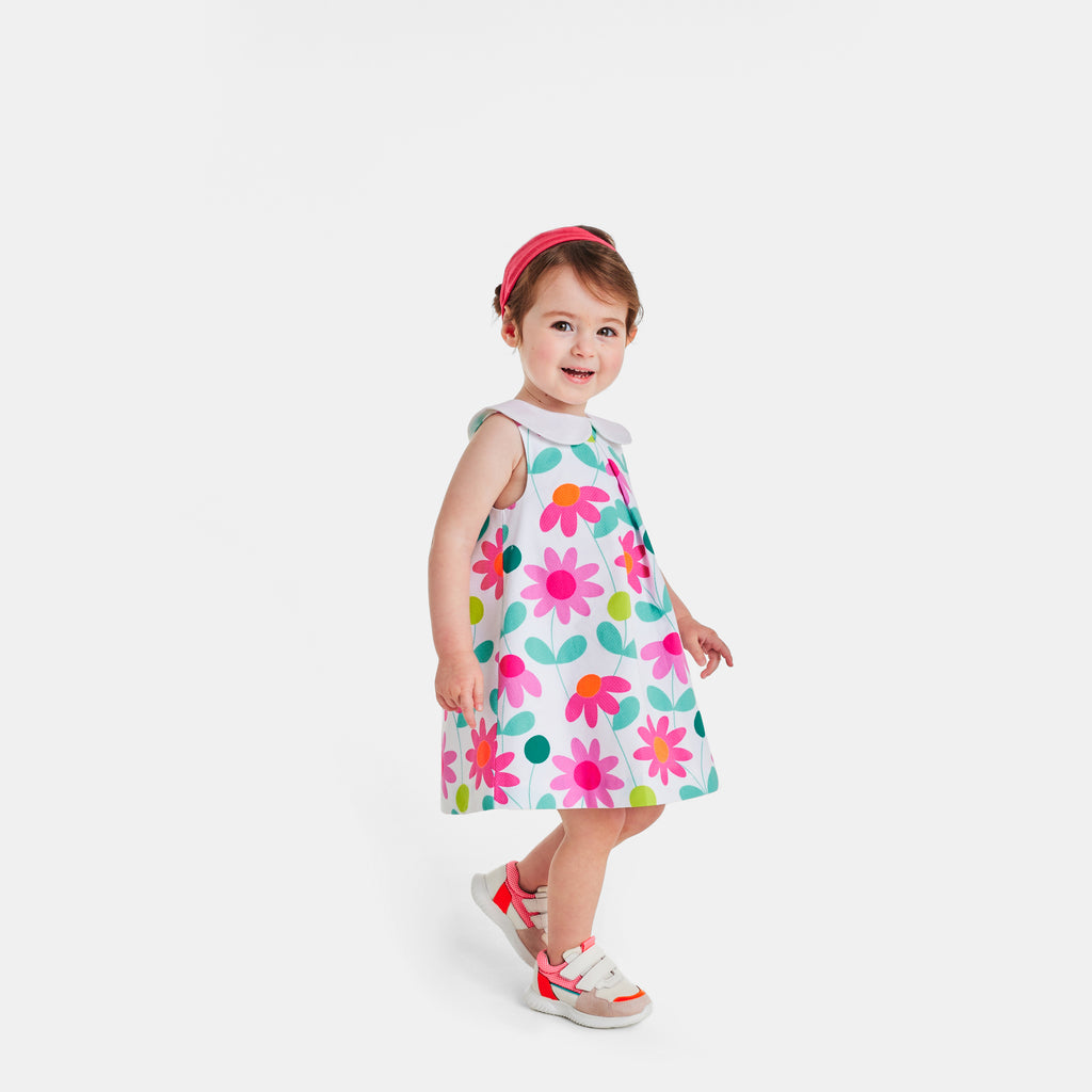 ジャカディのエレガンスがぎゅっと詰まったワンピース。コットンピケを使用しており、大きめのフラワーのプリント、コントラストの効いた幅広なクロディーヌ襟(丸襟)、正面のボックスプリーツが美しいモデル。日常着にもお祝いの場の装いにもぴったりな一着です。