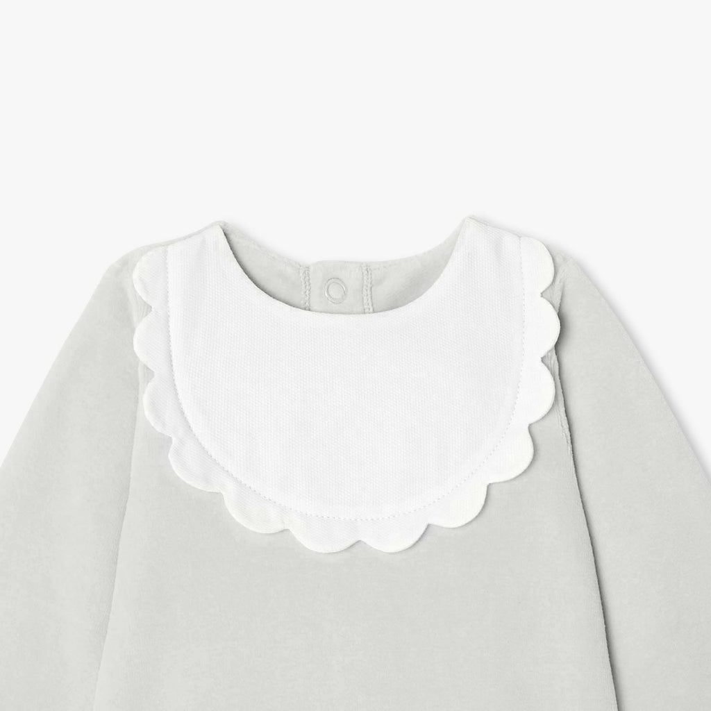 秋からのシーズンに、赤ちゃんの夜を快適にしてくれる足つきロンパース・パジャマ。エレガンスと実用性を兼ね備えた魅力たっぷりのモデルで、柔らかくしなやかなベロア調生地を使用しています。正面のスカラップが可愛らしく、目立ちにくい背面のスナップボタンで着脱も簡単。ワードローブの必需品となりそう。