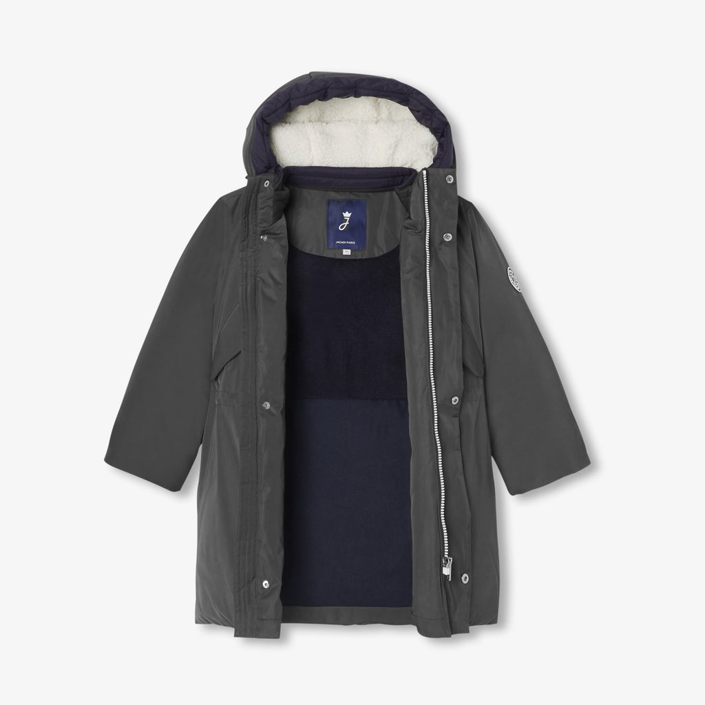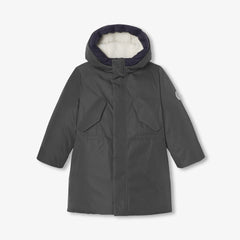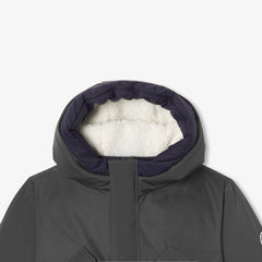 ファッションと実用性を兼ね備えたパーカー。今シーズンのマストアイテムです。防水性・防風性・通気性に優れたポリエステル素材を使用し、お子さまをしっかり守るロング丈のモデルです。上部にはベロア調、下部にはフランネル調の裏地を施し、フェイクファーの裏地付きのフードとリブ編みの袖口がモダンな印象を添えます。デイリーにはもちろん、ウールセーターやファーブーツと合わせれば、登山などアウトドアシーンにも活躍します。