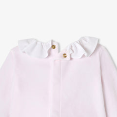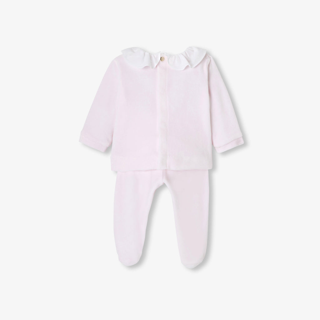 通園やデイリーユース向けにデザインされたアンサンブル。柔らかなベロア調生地で着心地が良く、エレガントな手刺しゅう入りの襟がポイントに。背面で開閉できるトップスと、伸縮性のあるウエストゴム入りのパンツが上下セットになった着脱の簡単なアイテムです。シックで実用性が高く、ご自宅用にもギフトにもおすすめ。