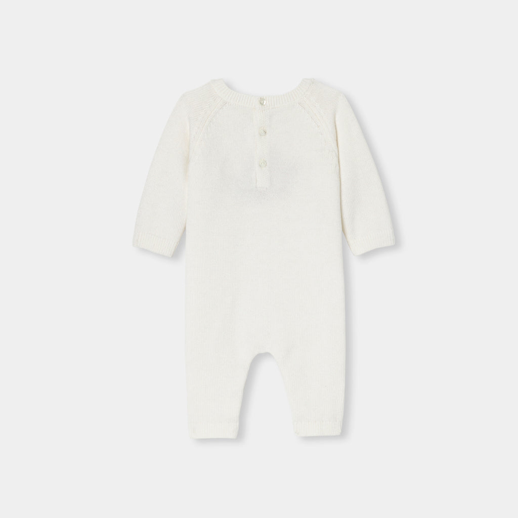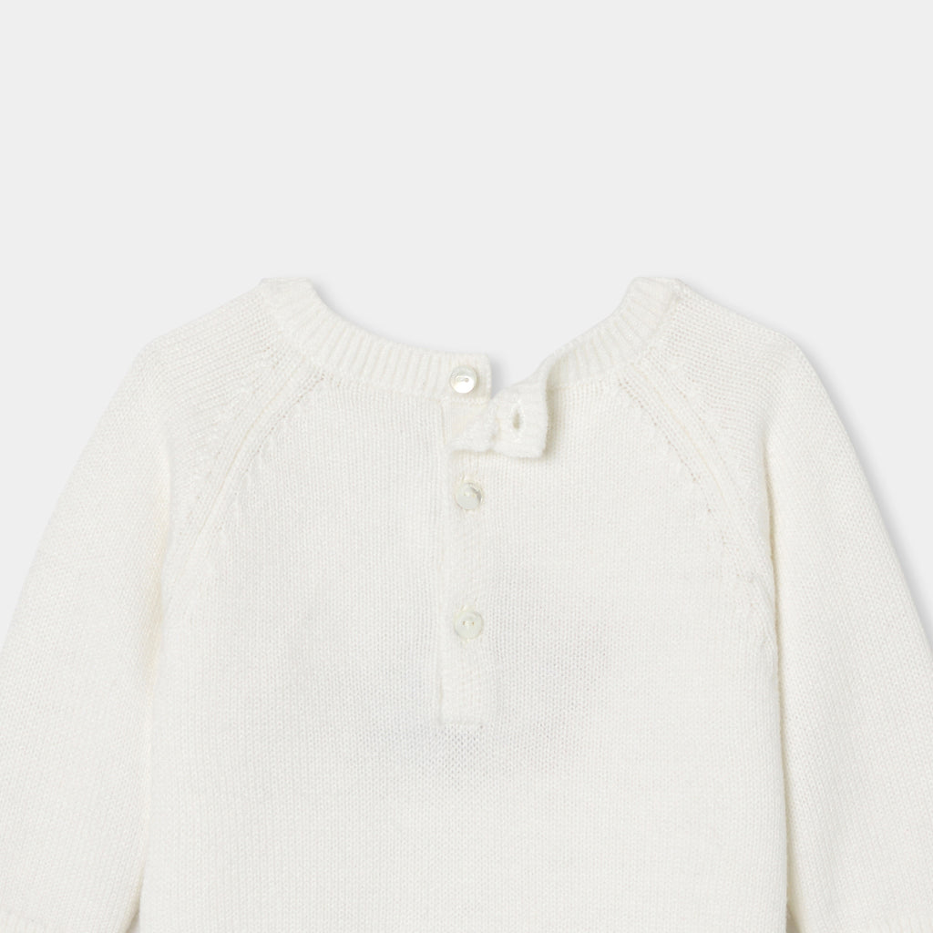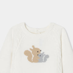 エレガンスと実用性を兼ね備えた冬向けのニットロンパース。レスポンシブルウールとカシミヤを使用し、丁寧に仕上げたモデルで、インターシャ織の小さなリスとサイドのケーブル編みがデザインを引き立てています。襟付きのボディスーツと小さなアンクルブーツを合わせれば素敵なルックに。赤ちゃんのワードローブに今すぐ選んでみて。