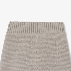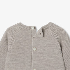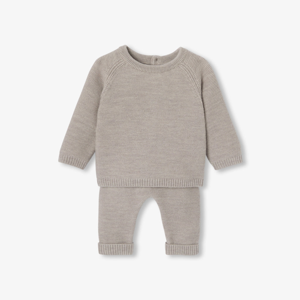 赤ちゃんを優しく包み込むガーター編みのニットアンサンブル。背面のボタンで開閉できるセーターと、伸縮性のあるウエストゴム入りのパンツが上下セットになっています。暖かで着心地が良く、ゆったりとしたシックなカットが特徴です。冬のデイリーユースの必需品となりそう。