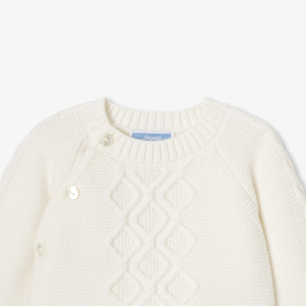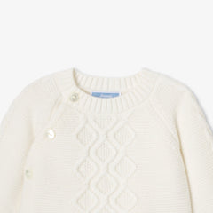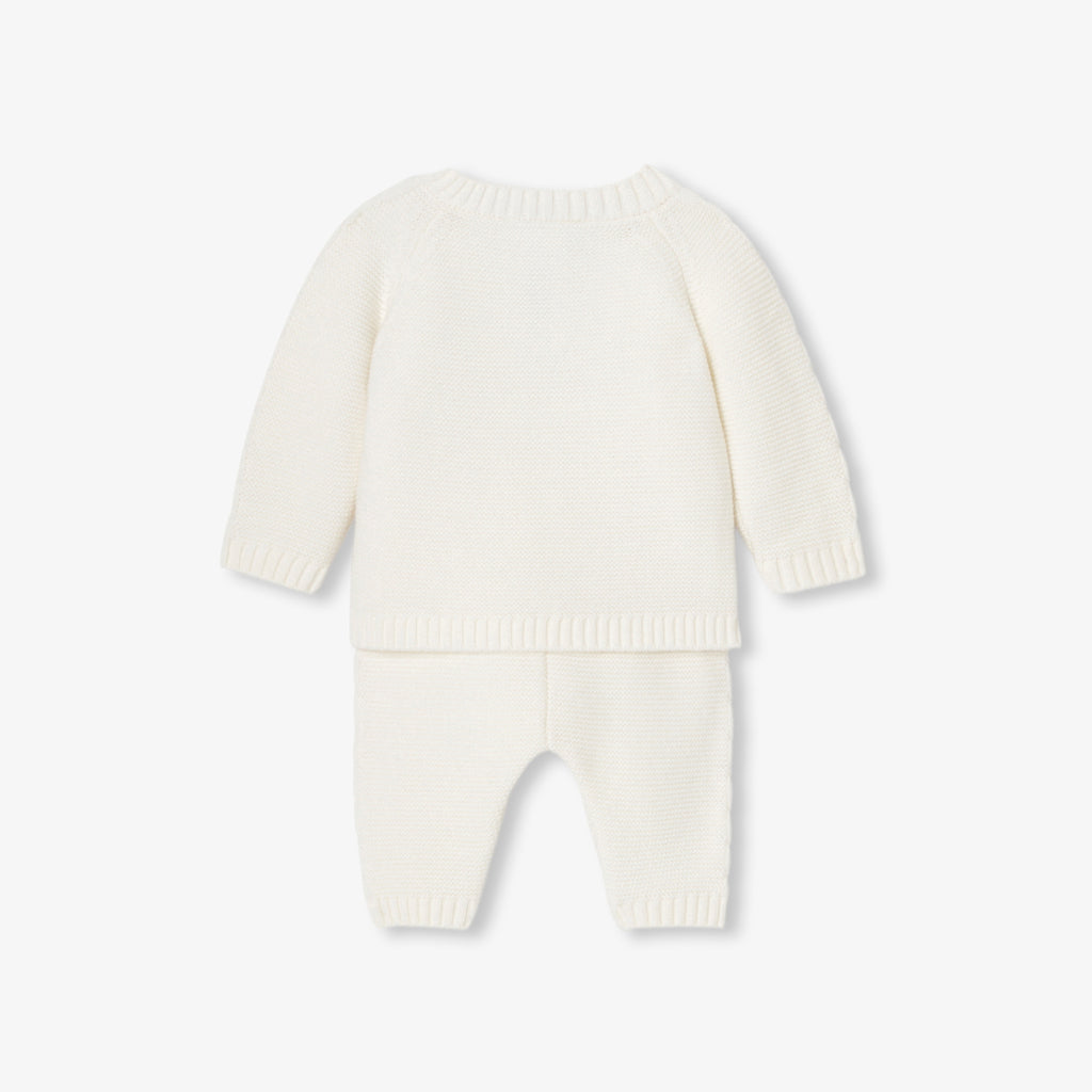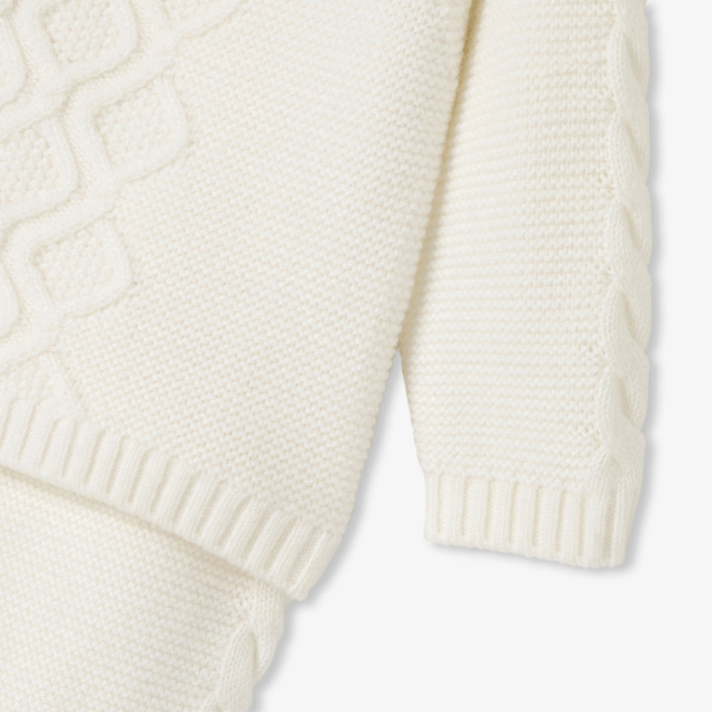 着心地の良さと上品さのバランスが絶妙なレスポンシブルウールのニットアンサンブル。シックなタータンニットをイメージしたケーブル編みのセーターと、伸縮性のあるウエストゴム入りのパンツが上下セットになっています。暖かな着心地が魅力で、アンクルブーツとスノースーツに合わせれば、冬のお出掛けやスキー旅行にもぴったりです。
