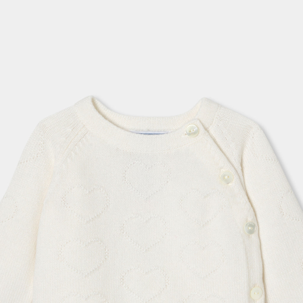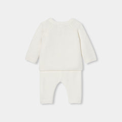ジャカディのエレガンスと技術が詰まったニットアンサンブル。ウールとカシミヤを使用し、暖かく柔らかに包み込むような着心地が魅力。正面ボタンで開閉できるトップスと、着脱の簡単な伸縮性のあるウエストゴム入りパンツが上下セットになっています。同系色のハートモチーフが可愛らしく、真冬のデイリーユースやホリデーシーズンで活躍しそう。ご自宅用にもギフトにもおすすめです。