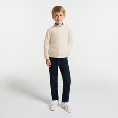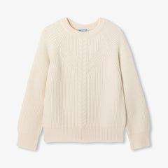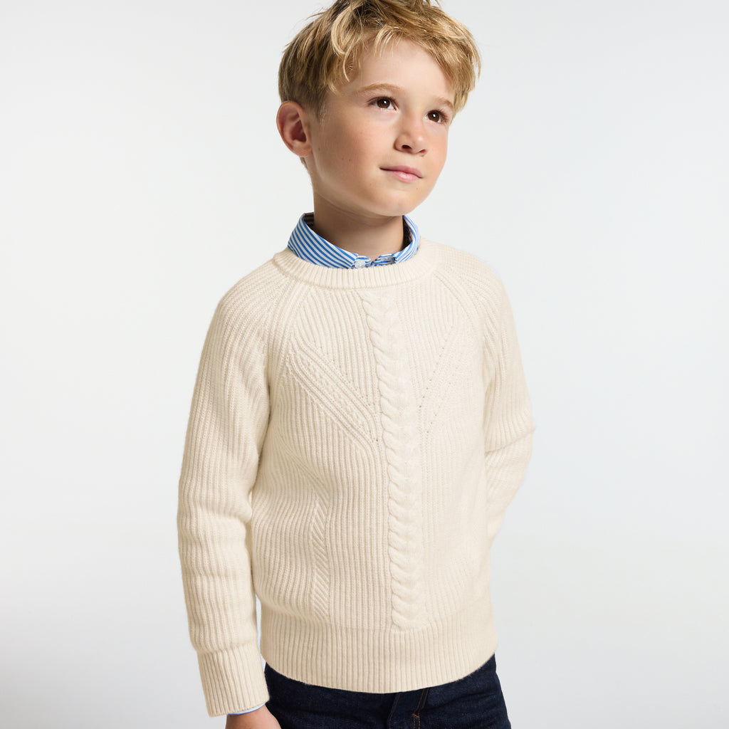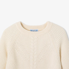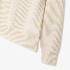 冬のワードローブに欠かせない、シックで魅力的なウールセーター。伝統的なアイルランドセーターにインスパイアされた一着。正面にはツイストニット、袖と背面にはパール編みのリブニットをあしらった、ミニマルな美しさが魅力です。ベロアパンツとブーツに合わせて。