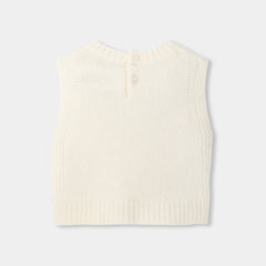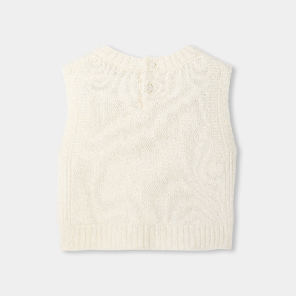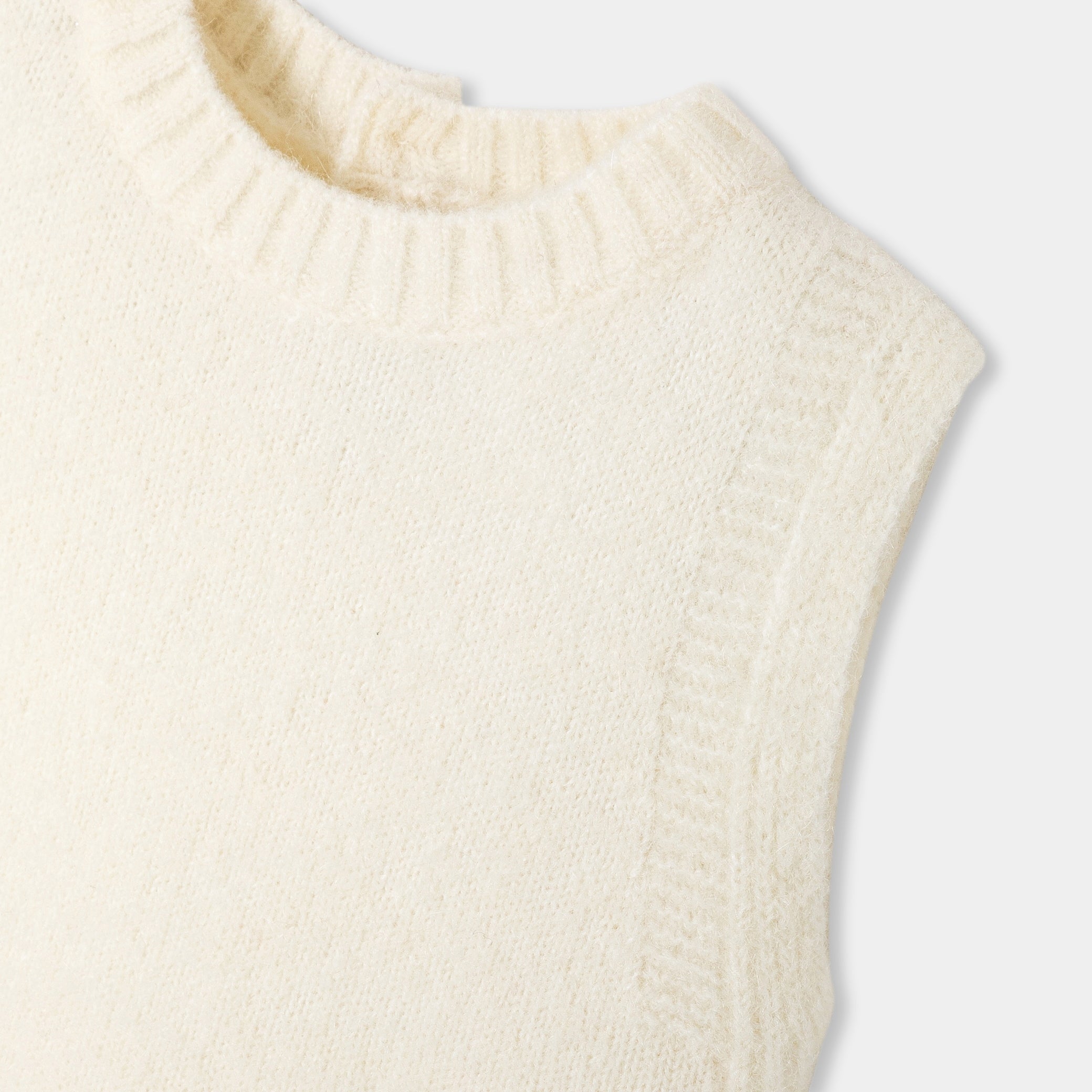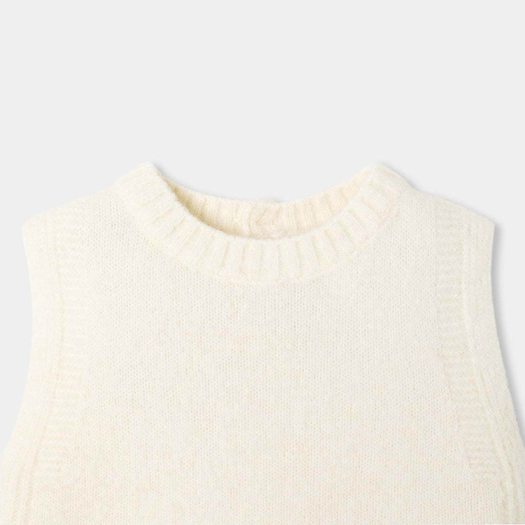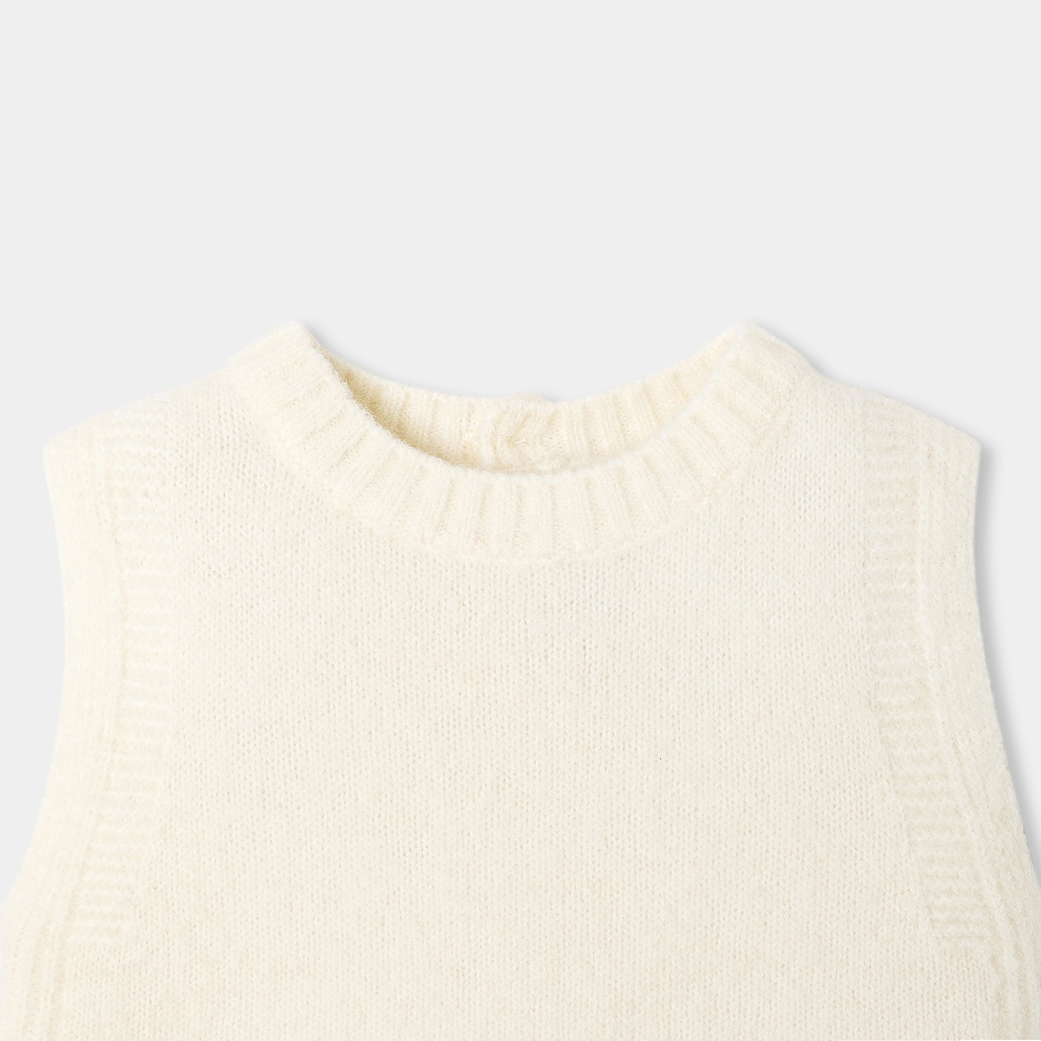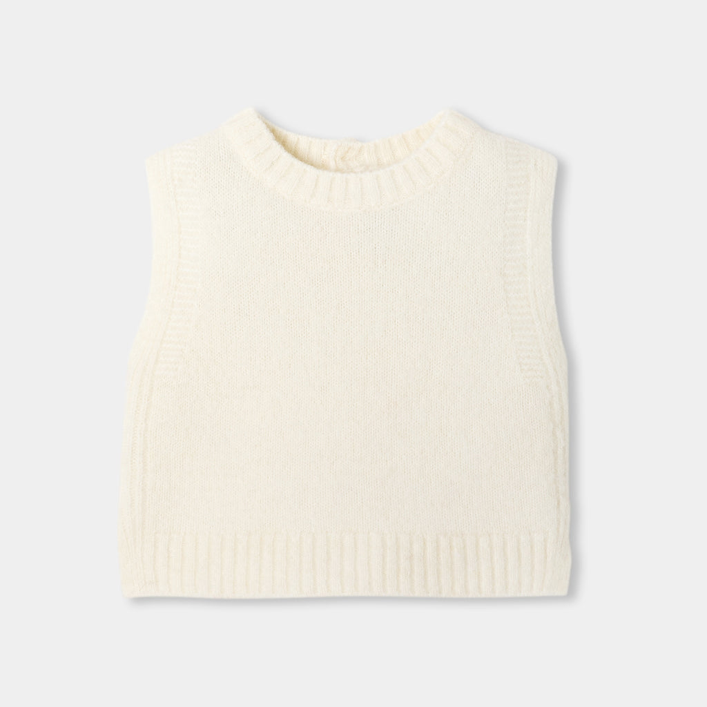 冬のワードローブで活躍するニットベスト。レスポンシブルウールとアルパカを使った、新しいニットです。ソフトでふんわり暖かく、リバティプリント(花柄)のブラウスとショートパンツに合わせると、フレンチシックなシルエットに。