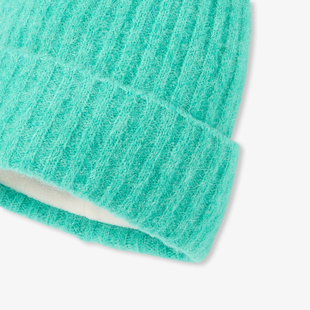 ウールとアルパカの新しい毛糸を使った、ふんわりとした帽子。ソフトなグリーンが魅力的です。リブニット素材で折り返し付き。マイクロフリースの裏地が最高の肌触りを実現した、ミニマルなデザインです。スヌードと手袋と合わせて。