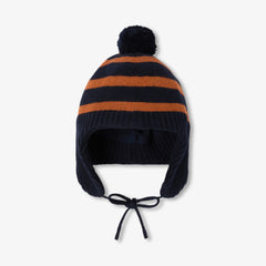 防寒性を備えた、カジュアルシックな冬の帽子。コットンとウールのニットの柔らかさと、マイクロフリースの裏地の快適さと暖かさ、そしてセーラーストライプとフェイクファーのポンポンが魅力の定番アイテムです。外出時やアクティビティでもしっかりと固定できるあご紐付き。