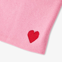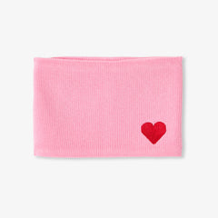ハートの刺しゅうがモダンな印象のスヌード。リブ編みニット製で、マイクロフリースの裏地付き。お揃いの帽子と手袋(別売り)を合わせれば、デイリーウェアがもっとおしゃれに。