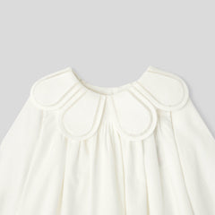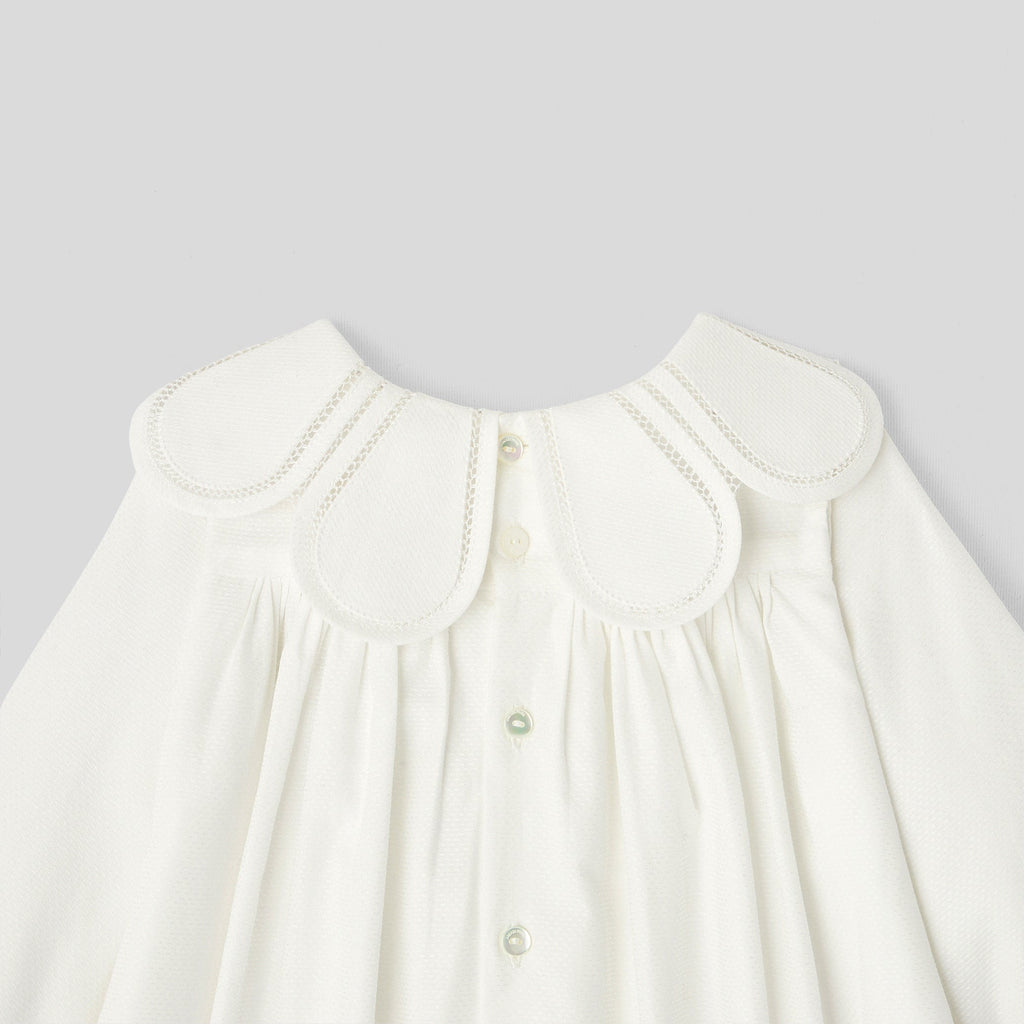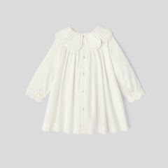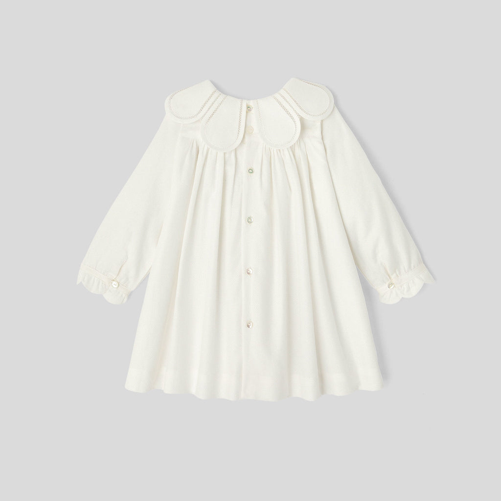 シックで美しいワンピースは特別なオケージョンにもぴったり。フリルの袖口に、ヘムステッチの大きめのペタルカラーが目を惹きます。