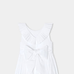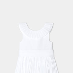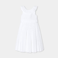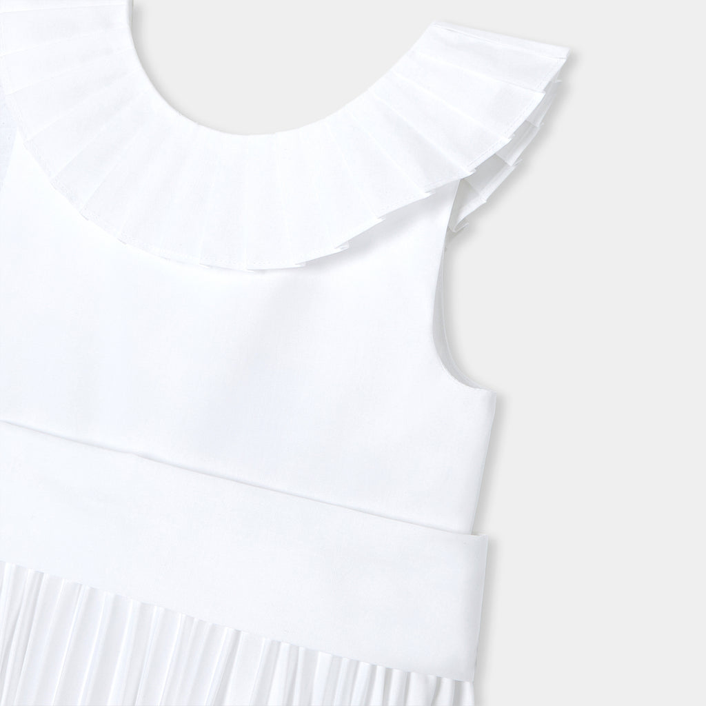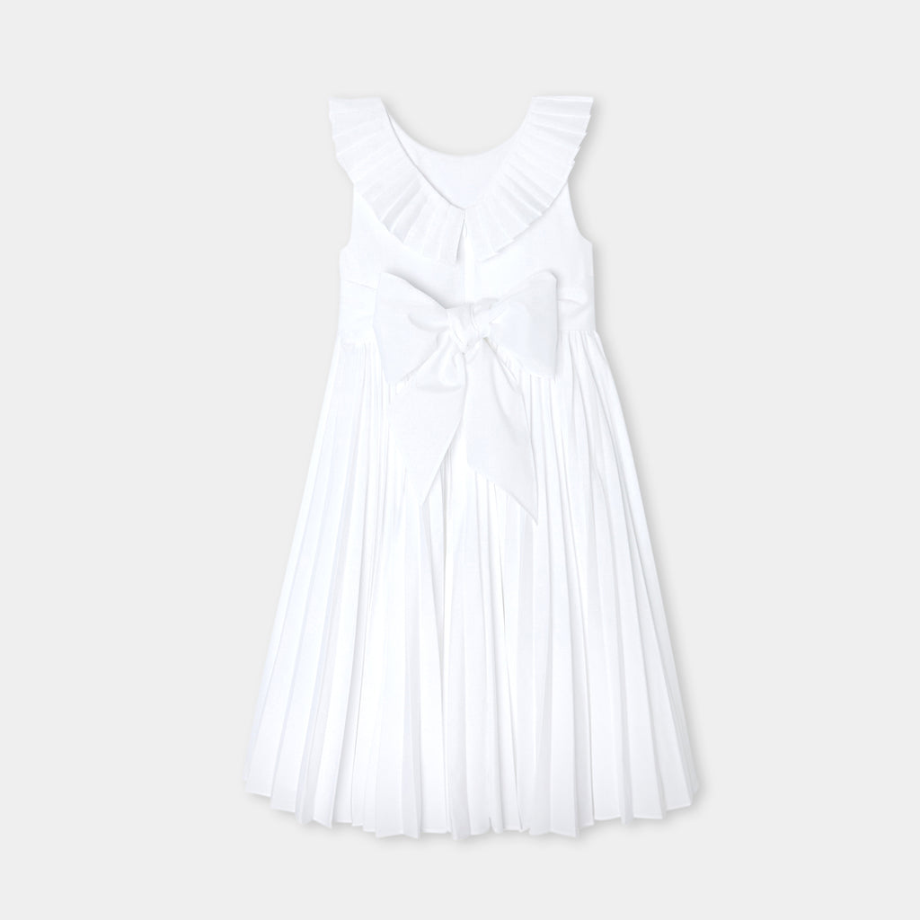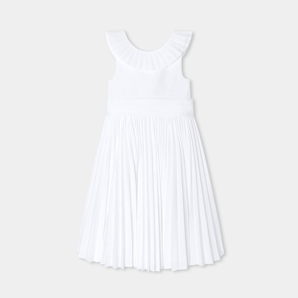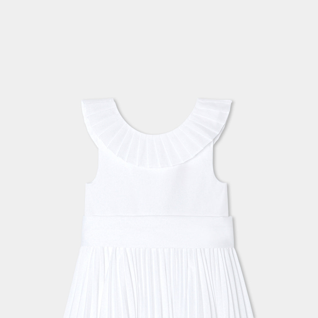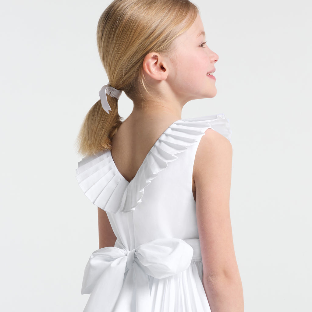 ジャカディの技術が詰まった、フレンチシックでエレガントなマキシ丈ワンピース。特別なオケージョン向けにデザインされたクチュール風のモデルで、背面のプリーツフリル、裾のパーマネントプリーツ、取り外し可能な幅広のグログランベルトが特徴的。大切な日には、可愛らしいサンダルとピンクのタフタ生地のカチューシャを合わせて。
