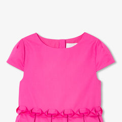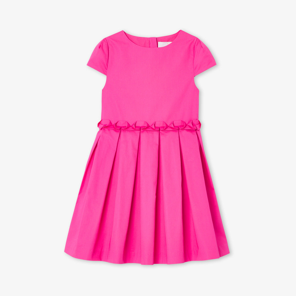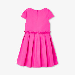 お祝いの日に活躍する、クチュール風のミニマルシックな半袖ワンピース。ピンクのサテンを使用しており、プリーツ入りの袖、折り紙風のウエスト入りプリーツ、フレア裾がポイントです。大切な日には、サンダルとタフタ生地のカチューシャと合わせて、エレガントな装いに。