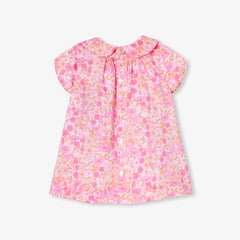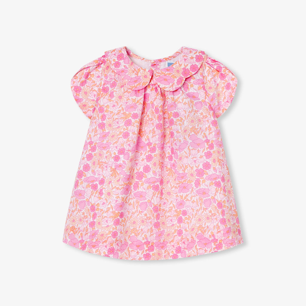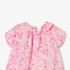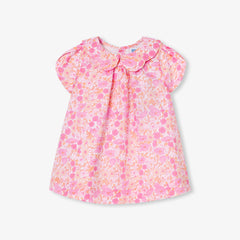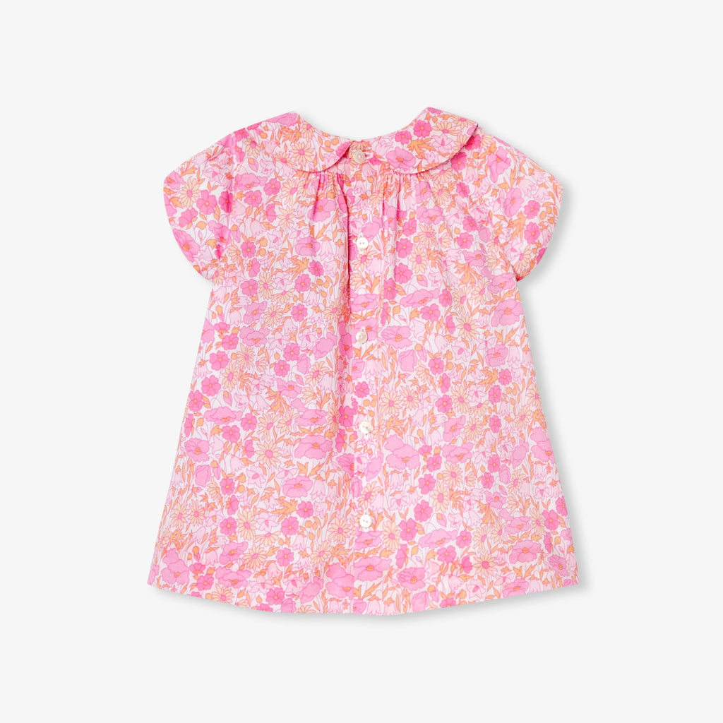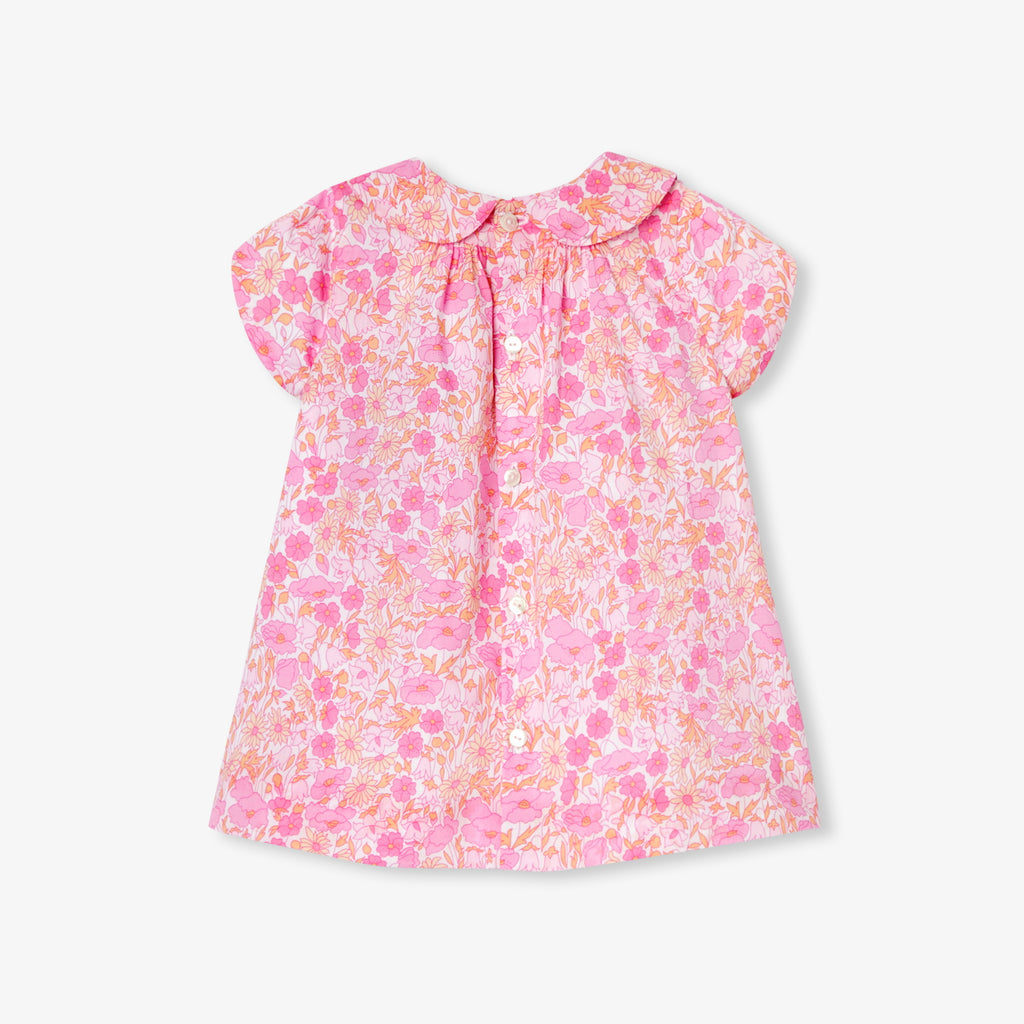 リバティプリント(花柄)が可愛らしい、夏の余韻たっぷりのワンピース。通園のワードローブに加えたくなる、シックで実用的な一着です。陽気な色合い、スカラップのバルーンスリーブ・襟、ギャザーのあしらいがポイントに。コットンボイルの裏地付きで着心地が良く、背面のボタンで開閉でき、着脱も簡単です。秋にはお揃いのカーディガン(別売り)と合わせたモダンなシルエットを楽しんで。