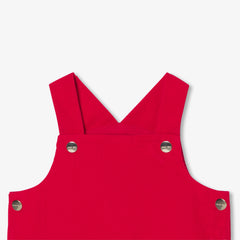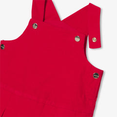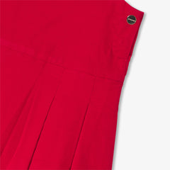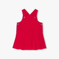 ベロア調生地のワンピースを、新しい季節にリニューアル。ややドロップウエストでモダンに仕上げました。裾にプリーツを入れ、ダンガリー風のストラップをあしらいました。明るい色合いのブラウスやセーラー服と合わせれば、シックでパリらしいシルエットに。