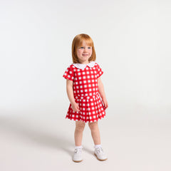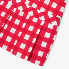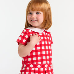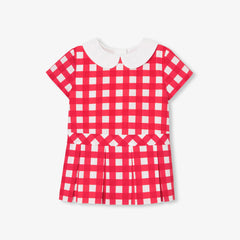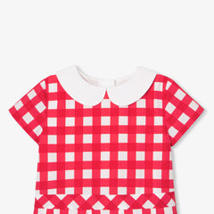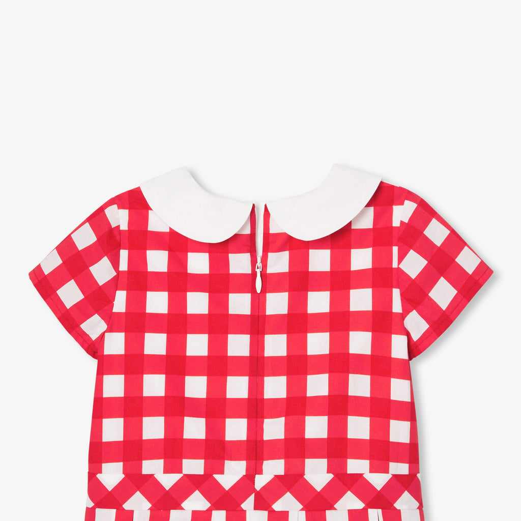 往年のモデルのレトロなエスプリを取り入れたワンピース。大きなギンガム柄がプリントされたポプリン製で、モダンにアレンジされたシルエットが特徴です。ピーターパンカラー(襟)とドロップウエスト、ボックスプリーツスカートに目立ちにくい背面のファスナーがモダンな印象です。通園に最適。