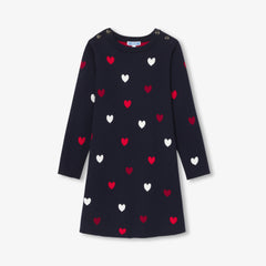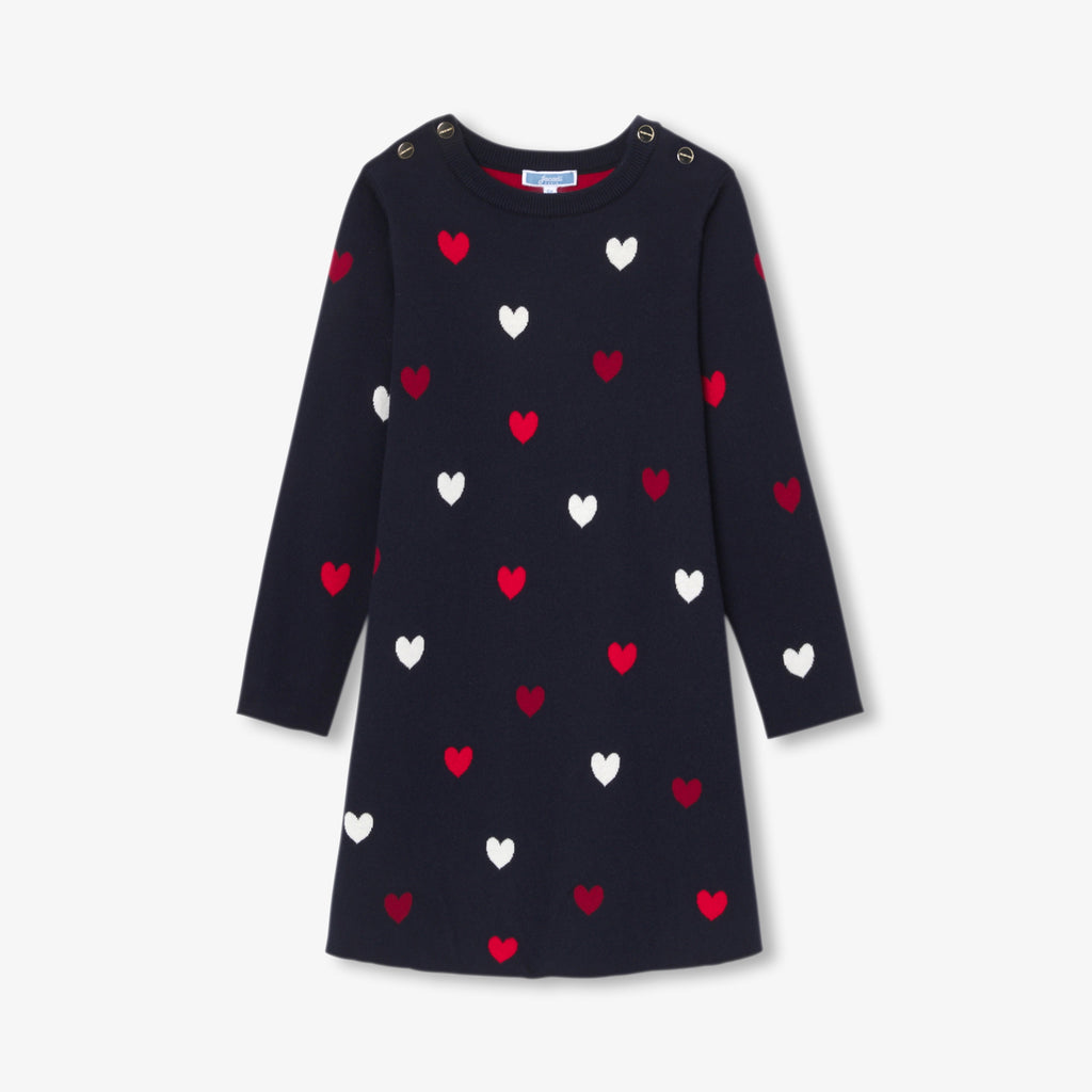 デイリーウェアにぴったりな、シックでモダンなワンピース。柔らかで肌触りの良いジャージーニット製です。ジャガード織のハートがアクセント。肩のスナップで着脱も簡単です。新しい季節にはタイツとシューズやブーティに合わせて。