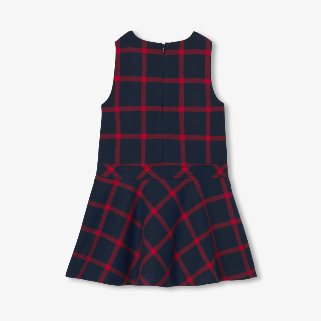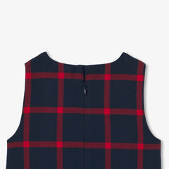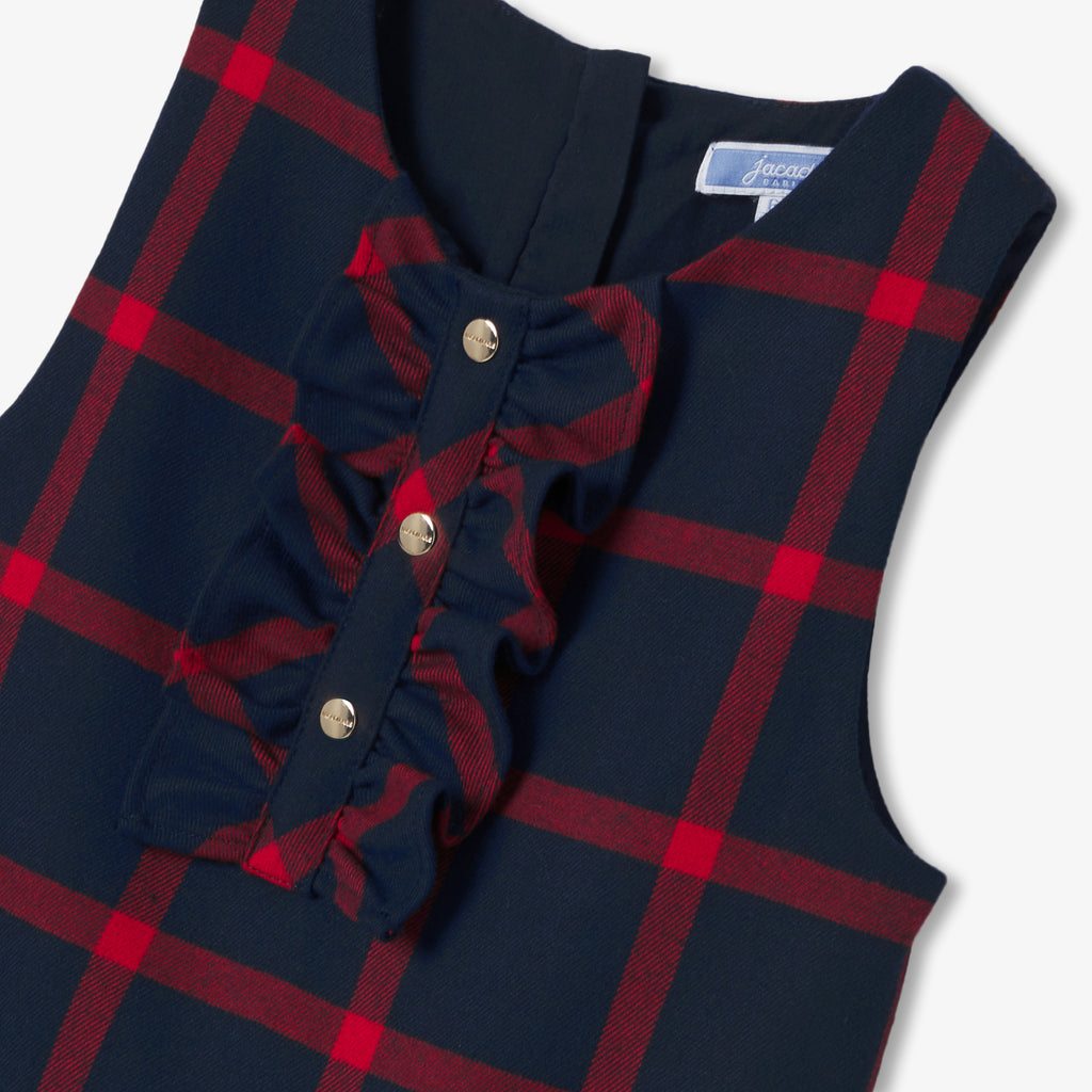 通園・通学のワードローブに欠かせないワンピース。大きめチェック柄がプリントされたエレガントなフランネル調生地を使用し、フレアカット、フリル襟、プリーツの裾が魅力的な一着です。ハイソックスと長袖Tシャツに合わせれば、プレッピーシックかつモダンな着こなしに。