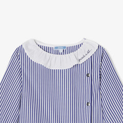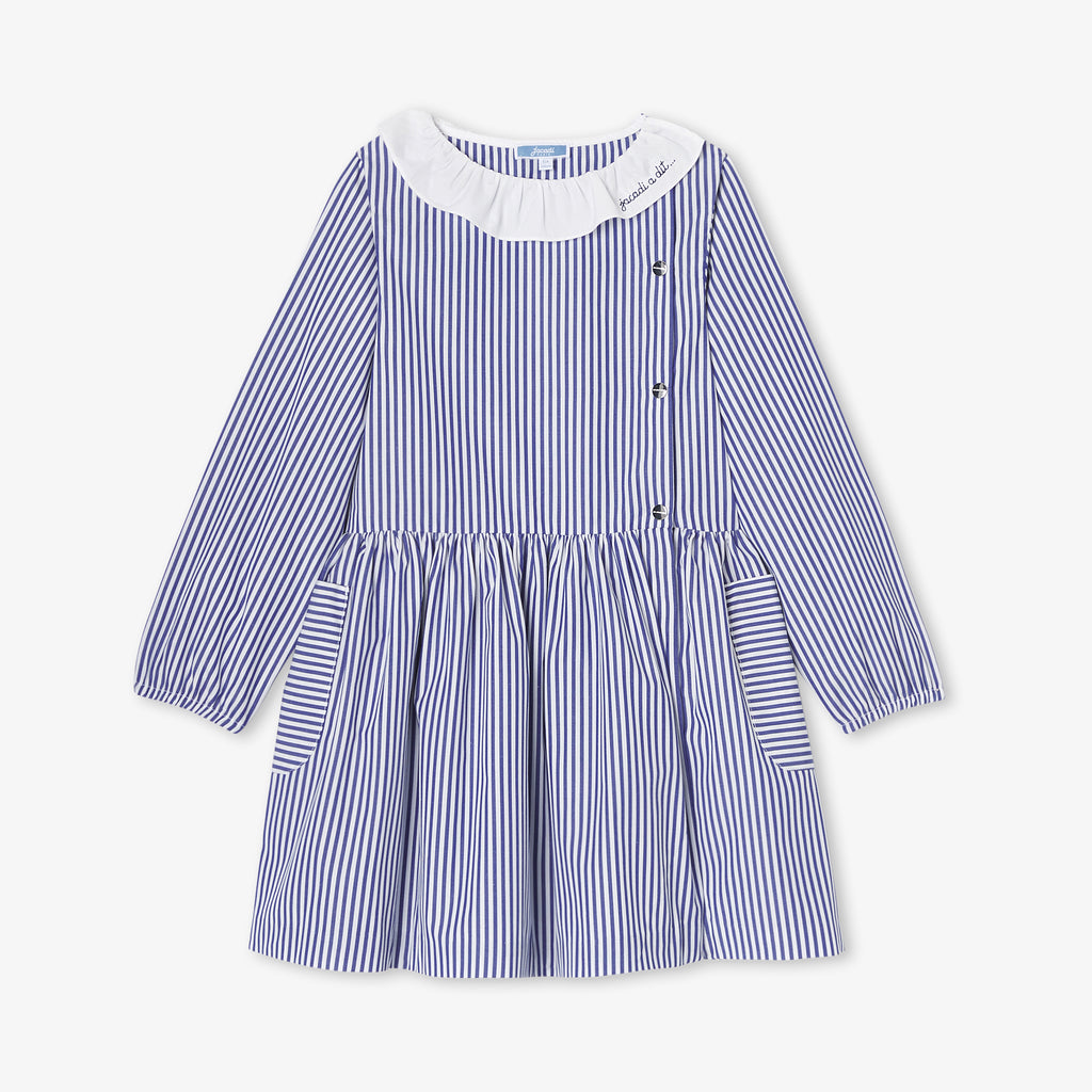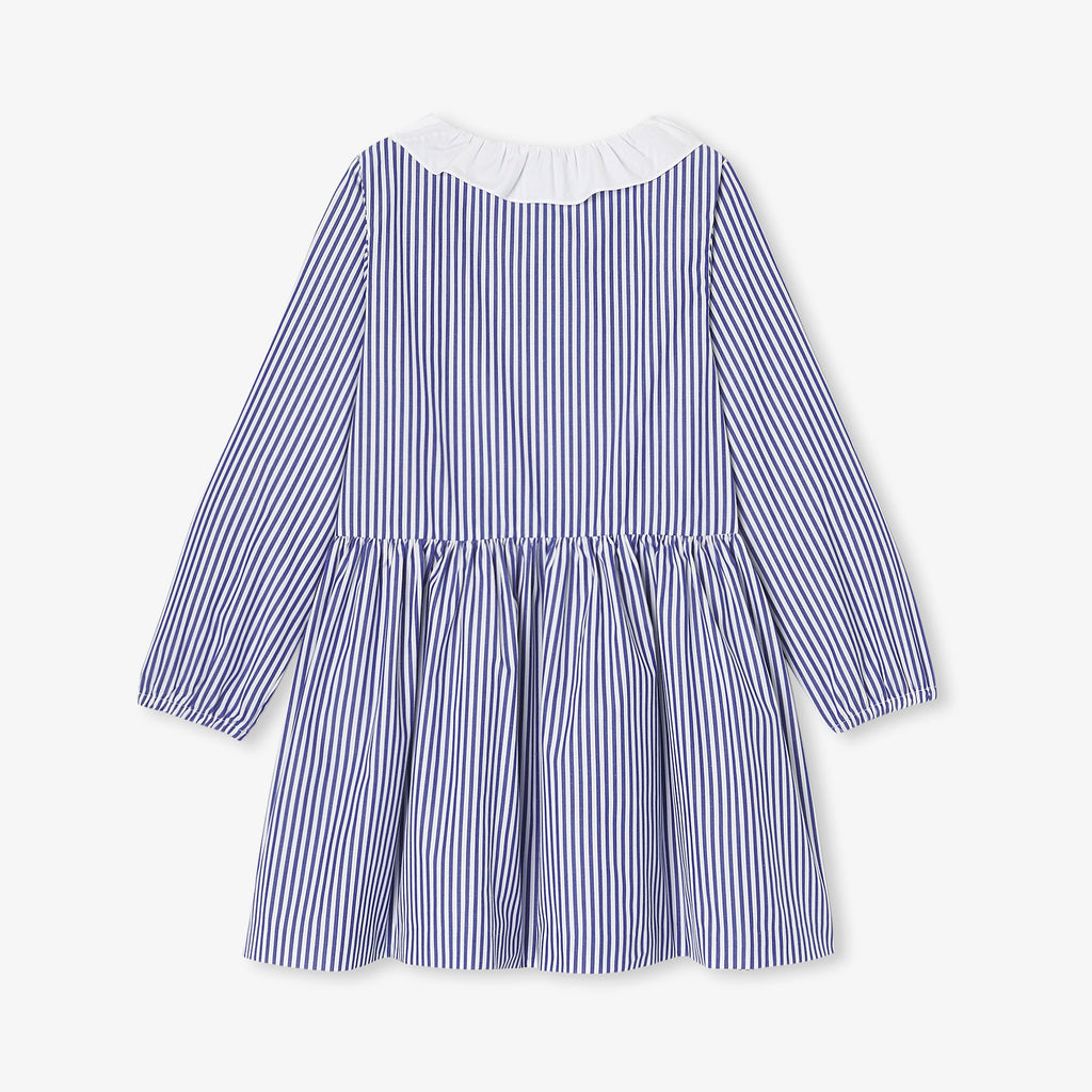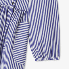 過去のデザインアーカイブからインスピレーションを得たドレスがこの秋華やかに復活。シックで幾何学的なシルエットのストライプポプリンに、刺しゅう入りのポプリン襟とパッチポケットがあしらわれています。スナップボタンで着脱も簡単。新学期が待ち遠しくなるアイテムです。