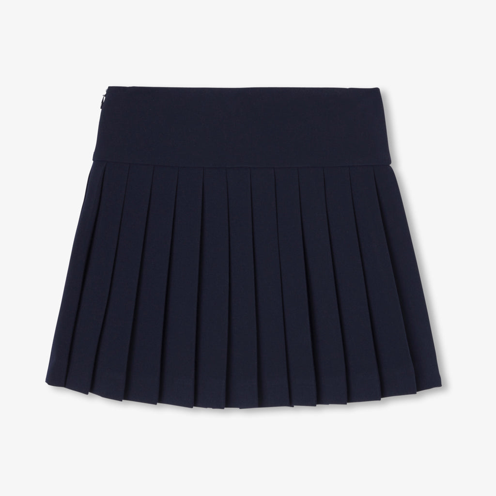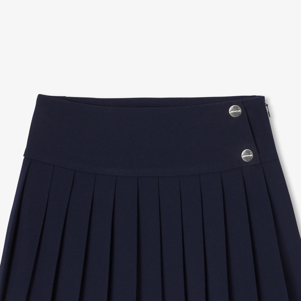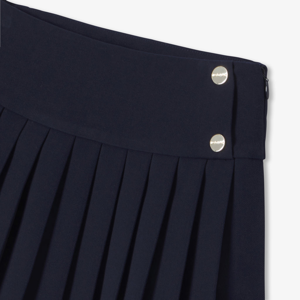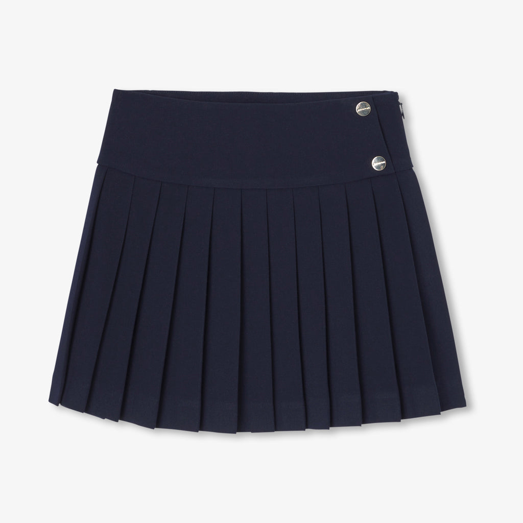 スクールスカート風の、柔らかでしなやかなクレープ素材のスカート。ゴールドの飾りボタンが目を惹きます。フリルの付いたシャツとハイソックスに合わせれば、シックでプレッピーな新学期のシルエットに。