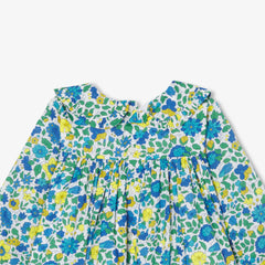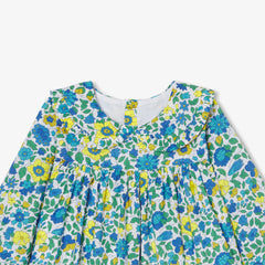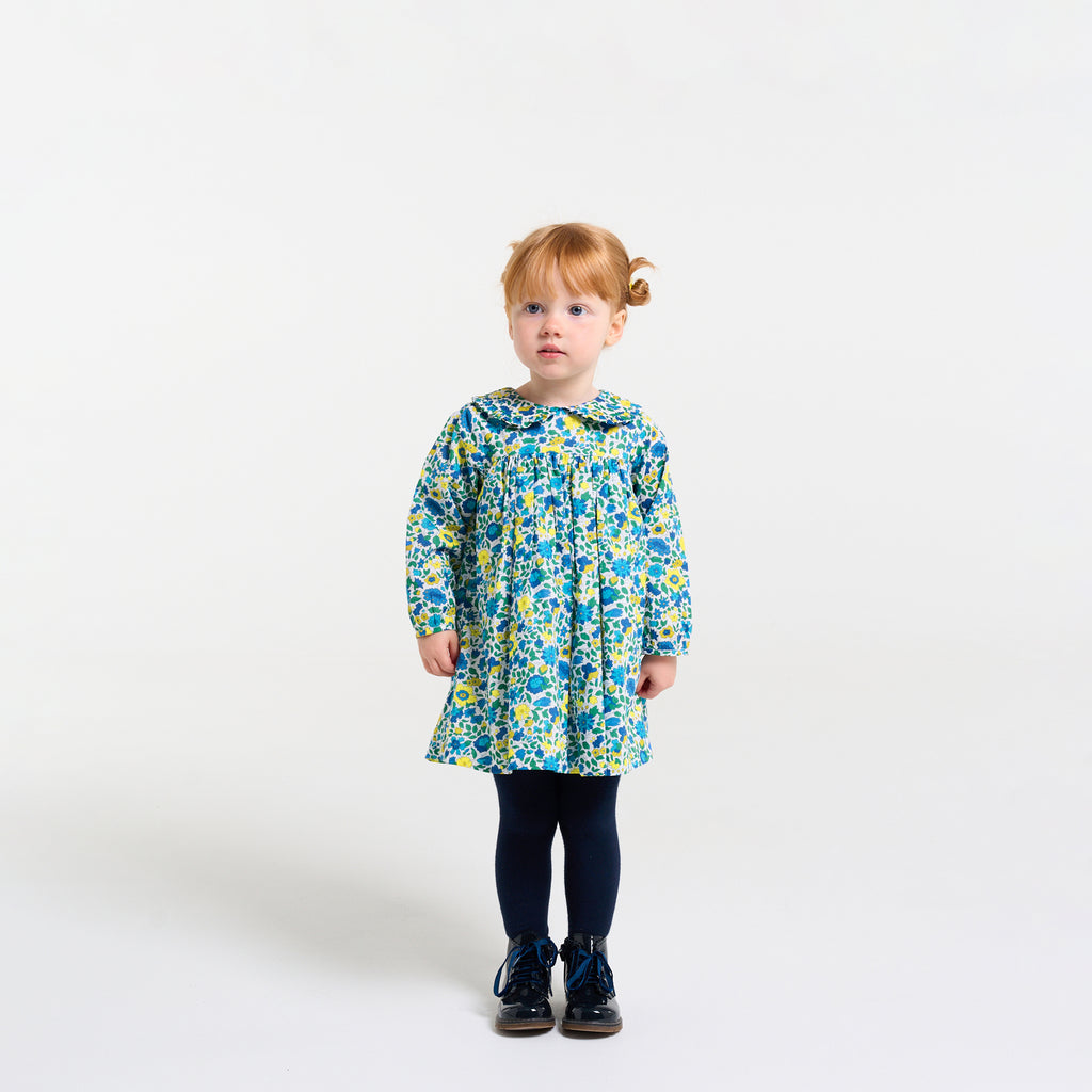 ジャカディのワードローブを象徴するリバティプリント(花柄)のワンピースが登場。フリル付きのピーターパンカラー(襟)、切り替えのギャザーウエスト、ブレスレットスリーブが魅力あふれるシックな花柄アイテムです。ブリティッシュコートを合わせれば、正統派シルエットに。