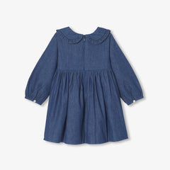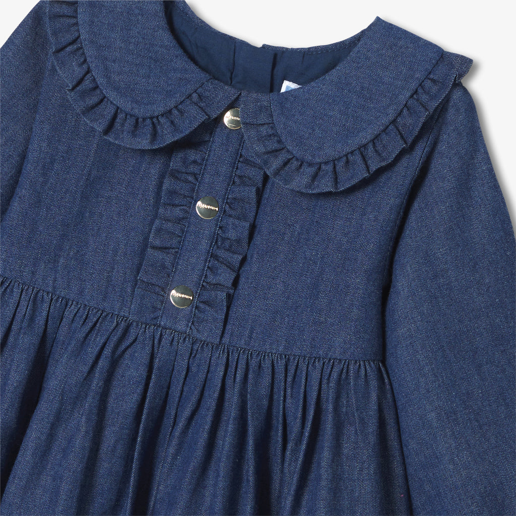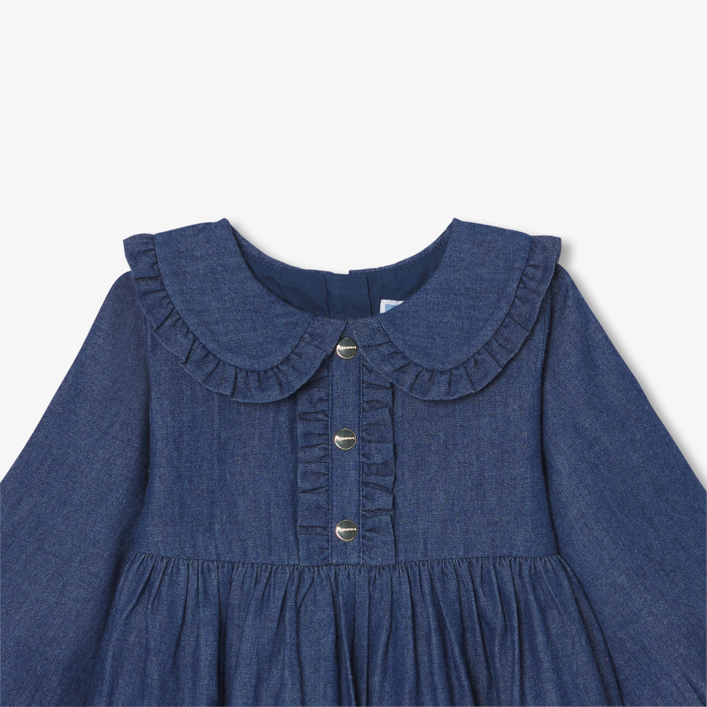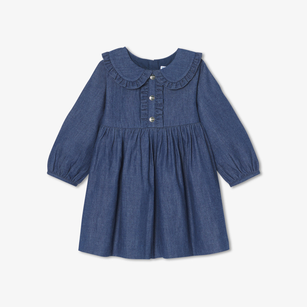 アイコニックでタイムレスな秋のデニムで、軽くてしなやかなワンピースを作りました。エレガントなフリル襟とフェイクボタン式プラケットがアクセントに。フリルをあしらった切り替えウエストと、コントラストの効いたブルトンステッチが特徴です。タイツとベビーシューズに合わせれば、シックで都会的なシルエットに。
