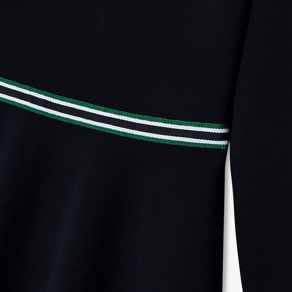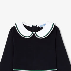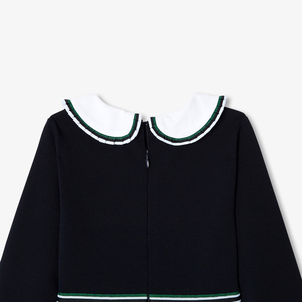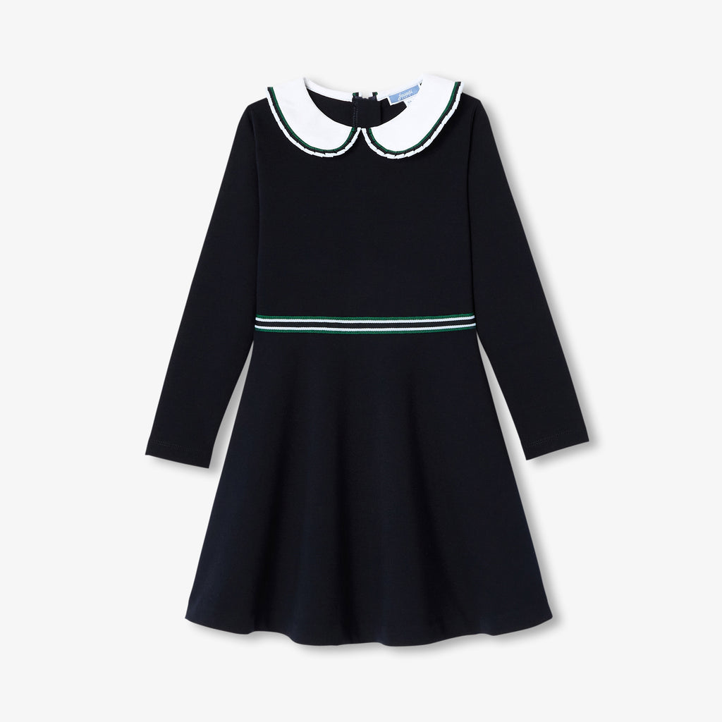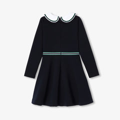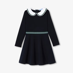 ディテールにこだわった、プレッピーシックなシルエットがエレガントなミラノニット製長袖ワンピース。フリルが施されたピーターパンカラー(襟)と、ストライプのグログランベルトが特徴です。新学期にはトレンチコートと合わせて、気軽にワードローブに加えたい一着です。