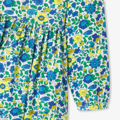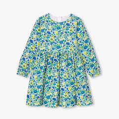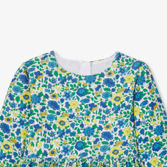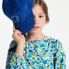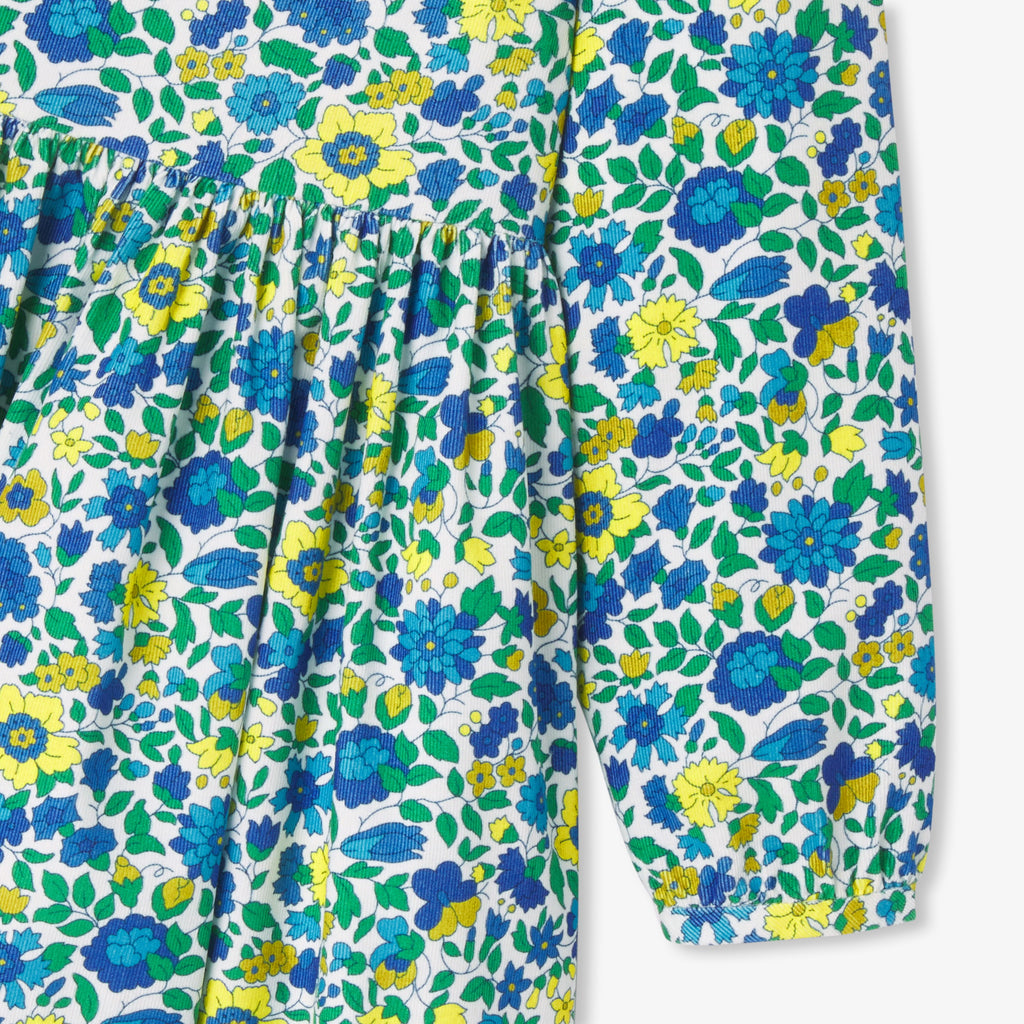 カッティングが美しい、シックでアイコニックなワンピース。細かいコーデュロイ生地にリバティプリント(花柄)を組み合わせました。ウエストのギャザーとコットンの裏地がシックで肌触りのよい一着です。タイツとメリージェーンを合わせて。
