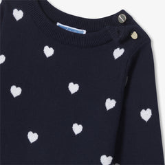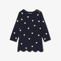 小さなハートと可愛らしいスカラップがシックなワンピース。ソフトでしなやかなオーガニックコットンのニット製。肩のボタン式プラケットで、ボディスーツの上から簡単に着られます。ミッドシーズンのコートやレインコートと合わせれば、通園やアクティビティにぴったり。