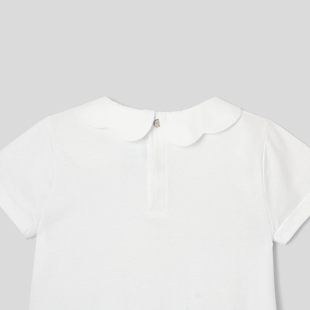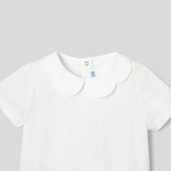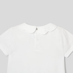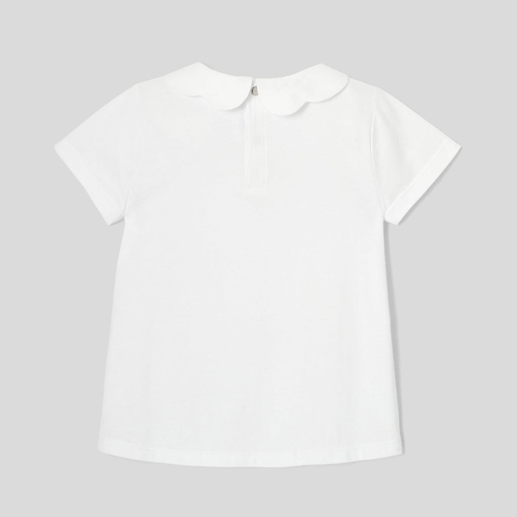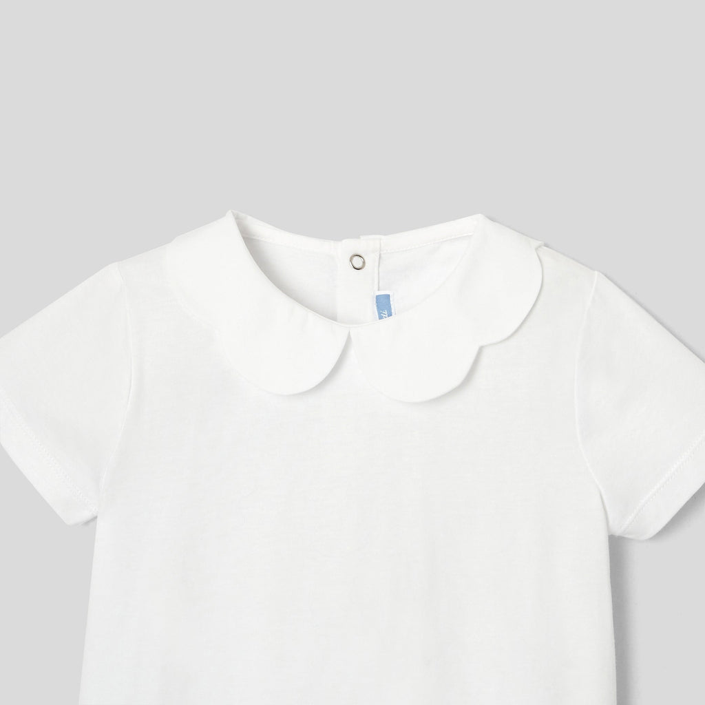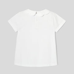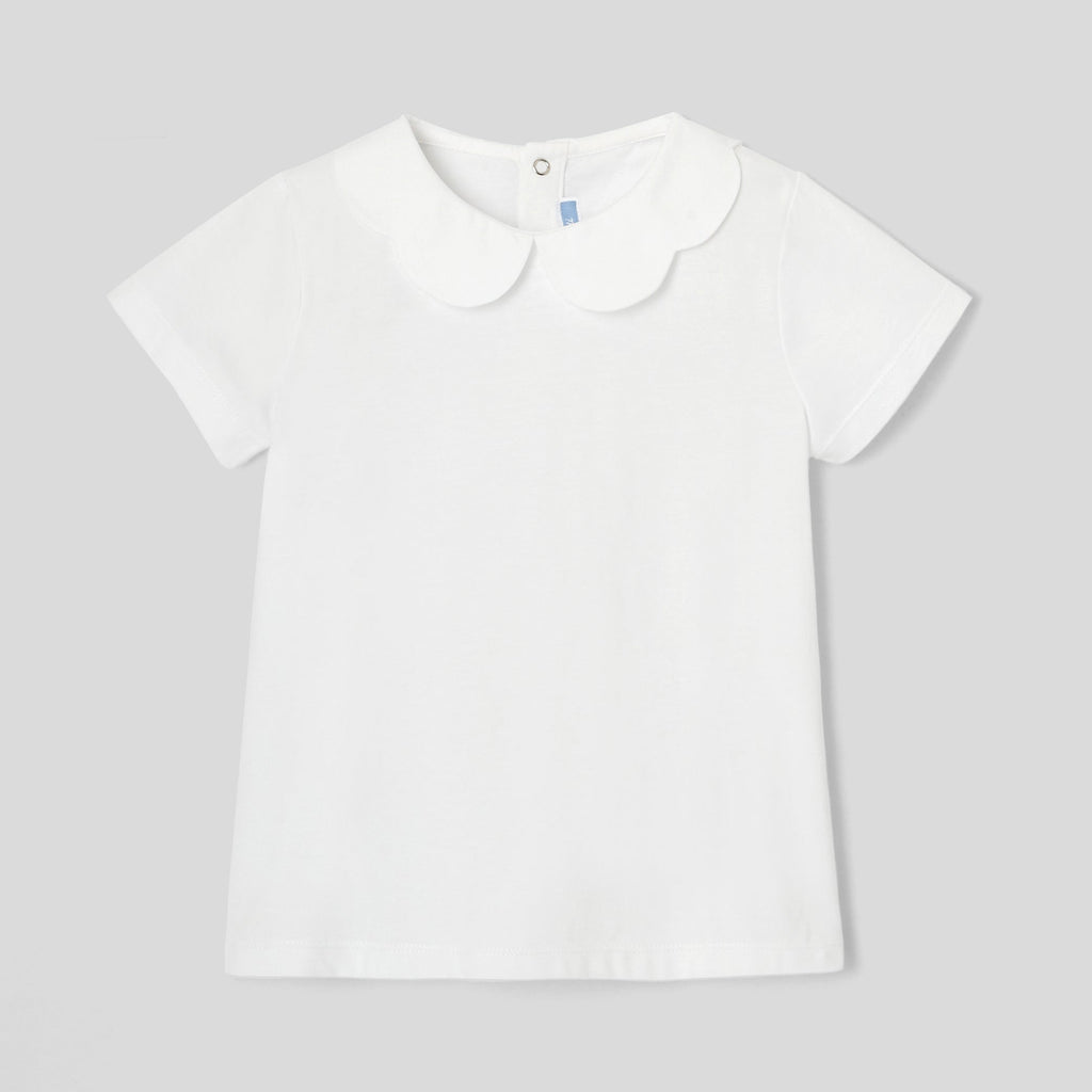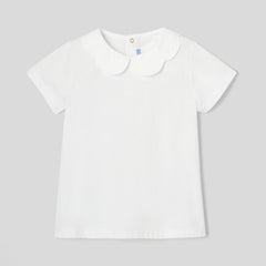 エレガントさとカジュアルさを兼ね備えたスカラップ襟の半袖Tシャツ。デイリーユースしやすい一枚です。