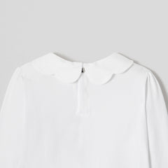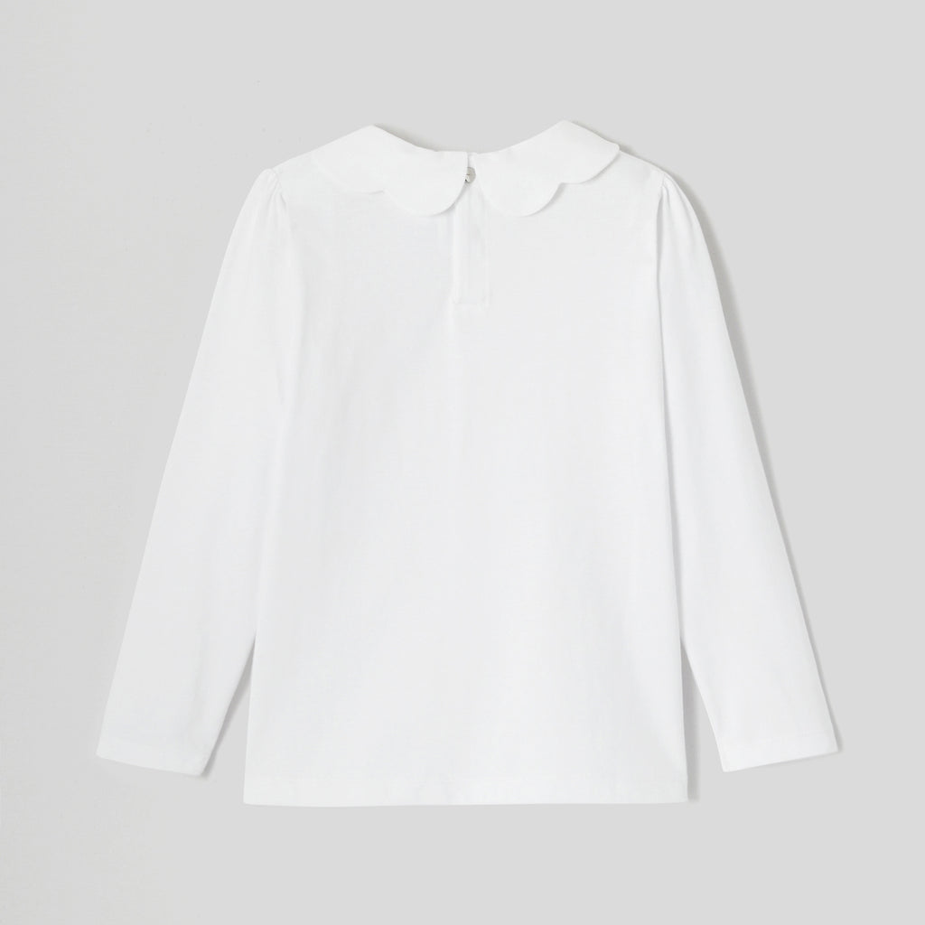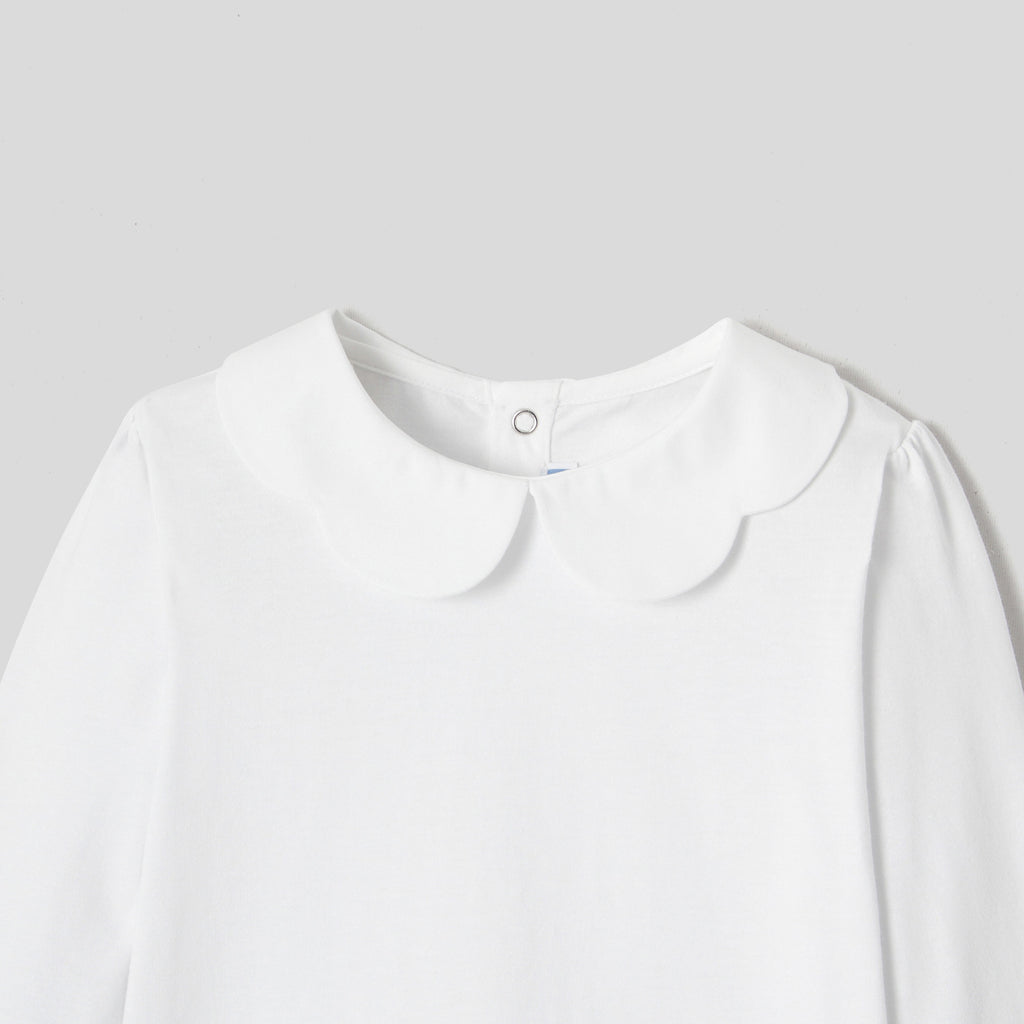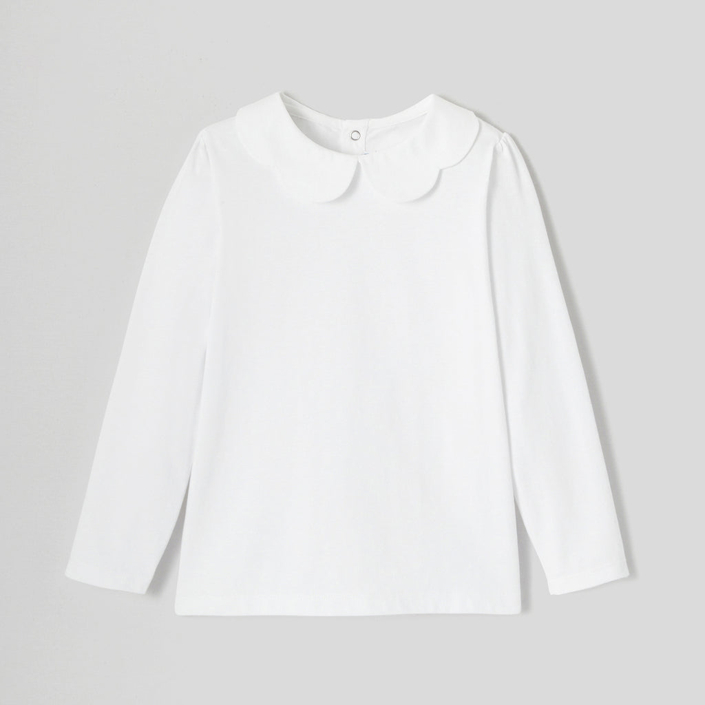 シックなスカラップ襟の長袖Tシャツ。オーガニックコットンを使用しており、背面のスナップボタン開閉で着脱も簡単。スカートにもフレアパンツにも合わせやすく、春の季節の始まりにぴったりです。