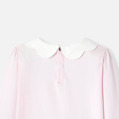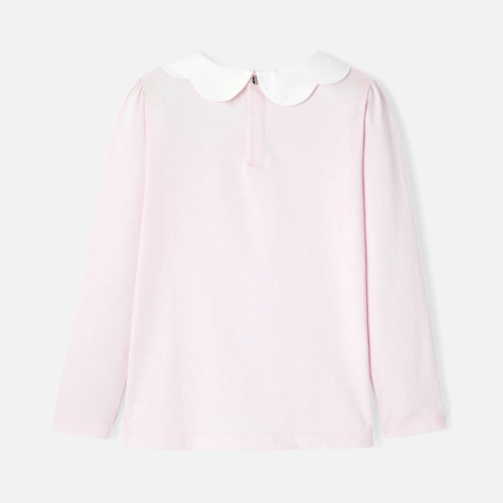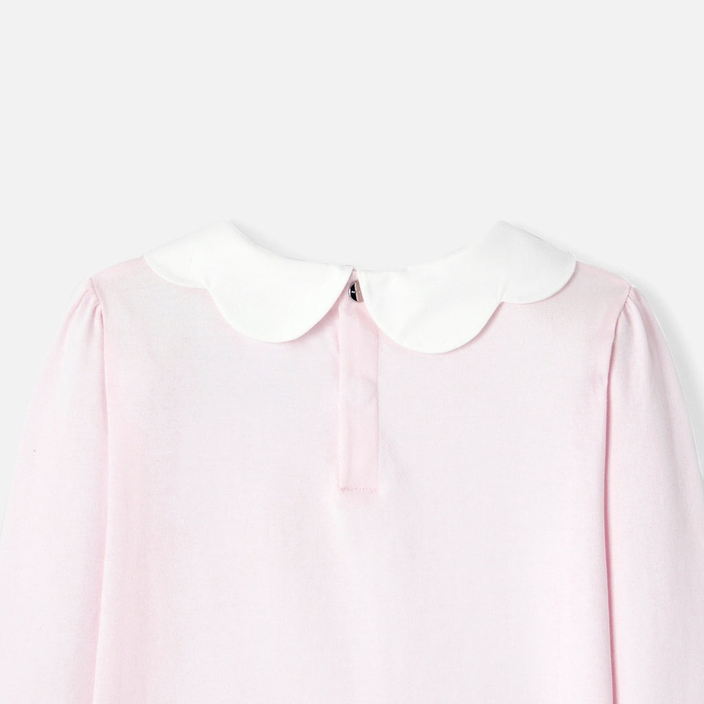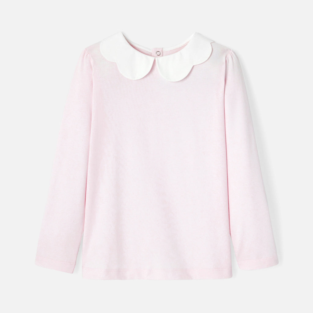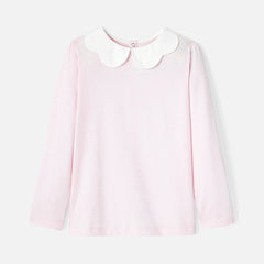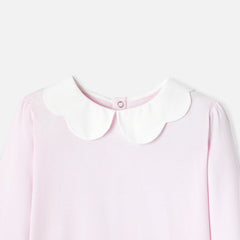 シックなスカラップ襟の長袖Tシャツ。オーガニックコットンを使用しており、背面のスナップボタン開閉で着脱も簡単。スカートにもフレアパンツにも合わせやすく、季節の始まりにぴったりです。