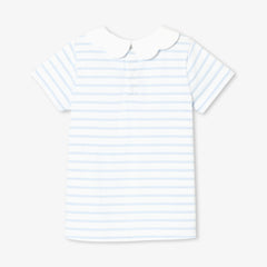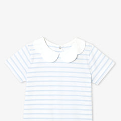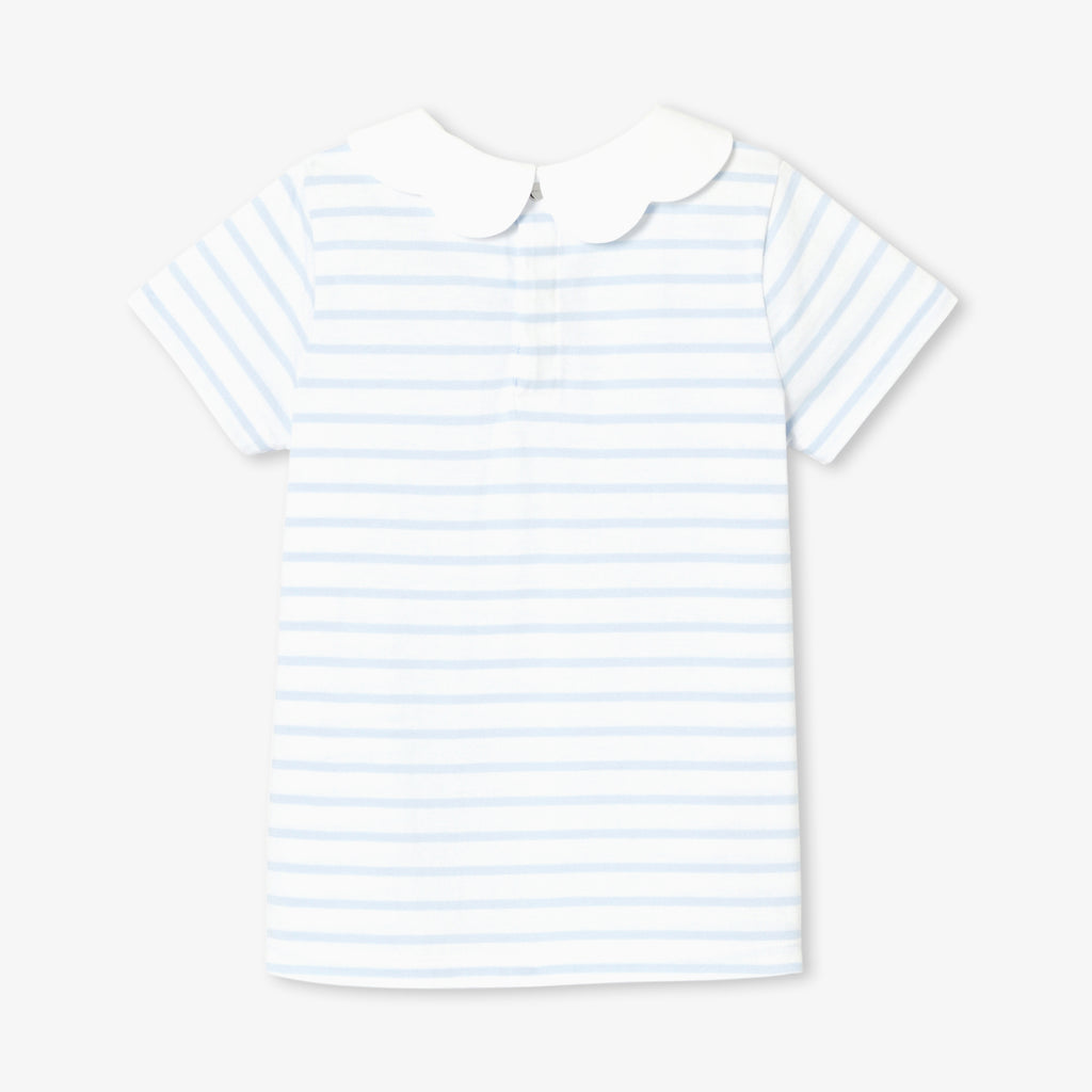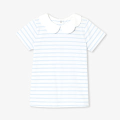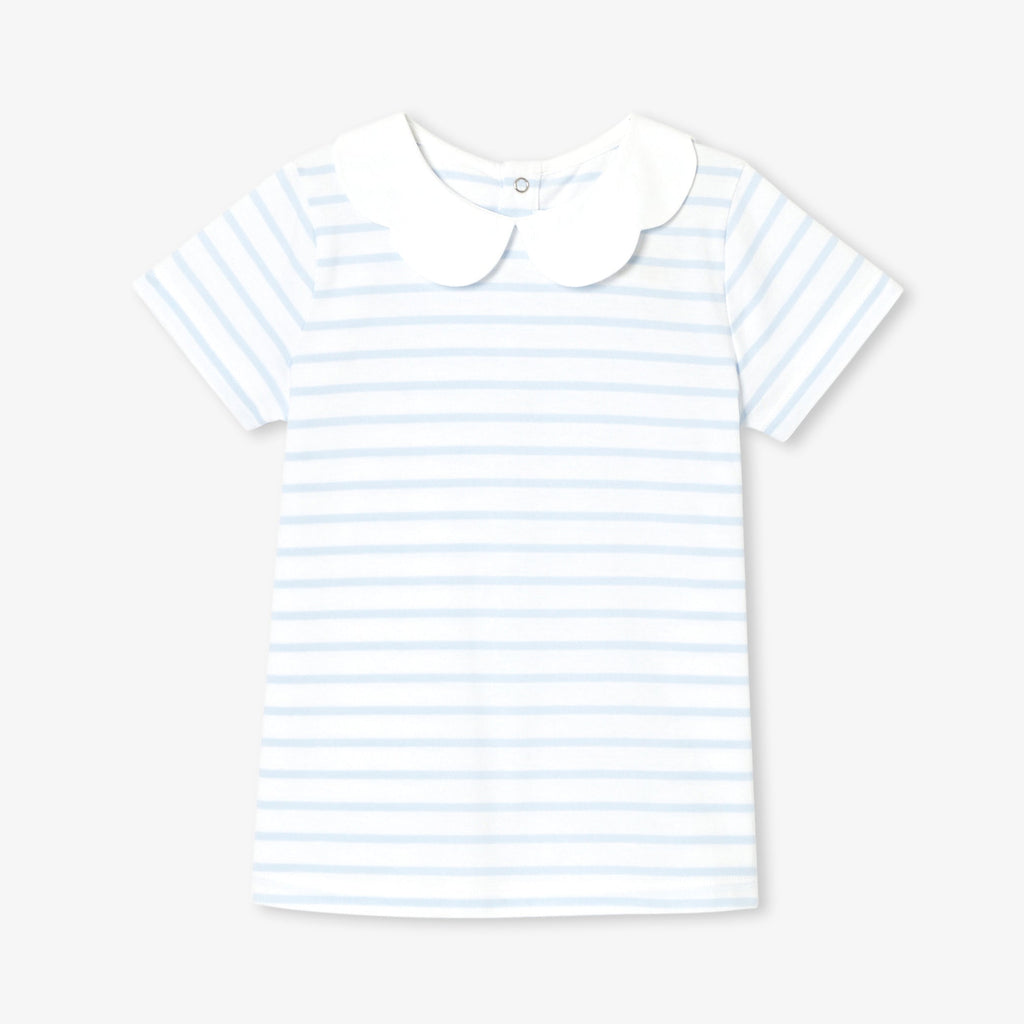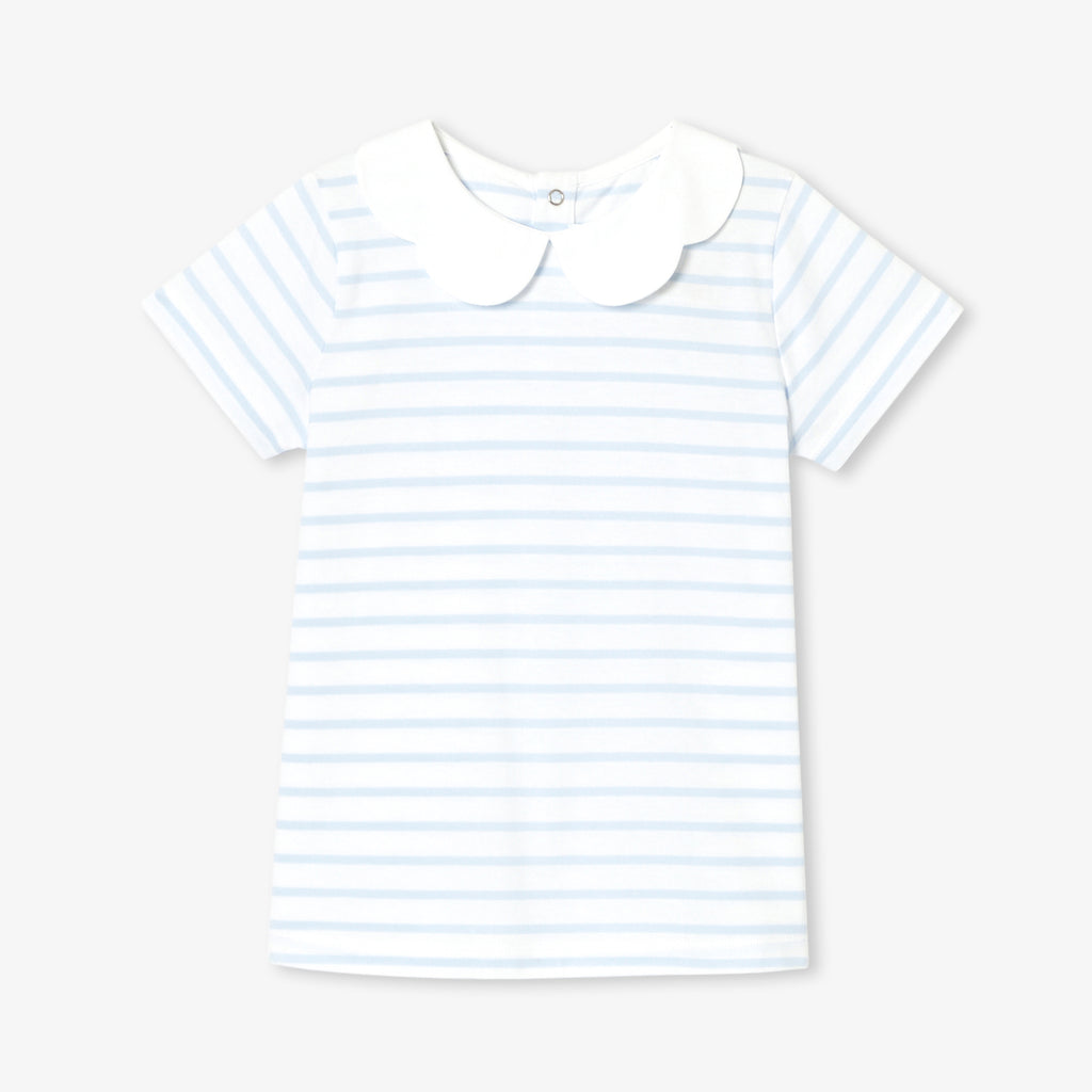 春らしいカジュアルシックなTシャツ。細めのストライプをあしらったセーラースタイルの一枚で、ポプリンのスカラップ襟がパリシックな雰囲気を演出しています。デイリーユースしやすく、春夏には、ワイドジーンズやプリーツスカートを合わせるのがおすすめ。