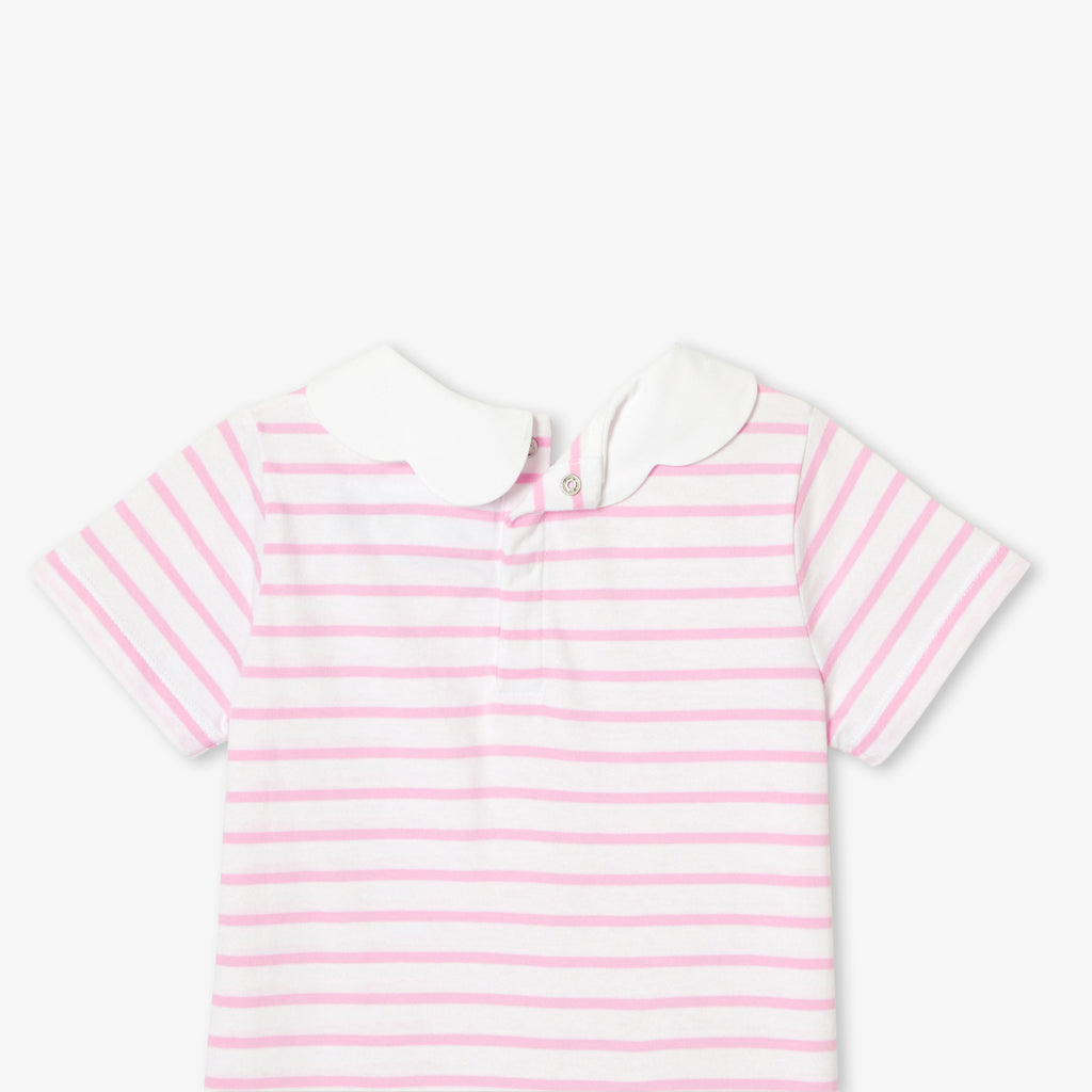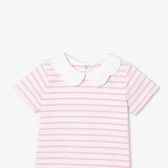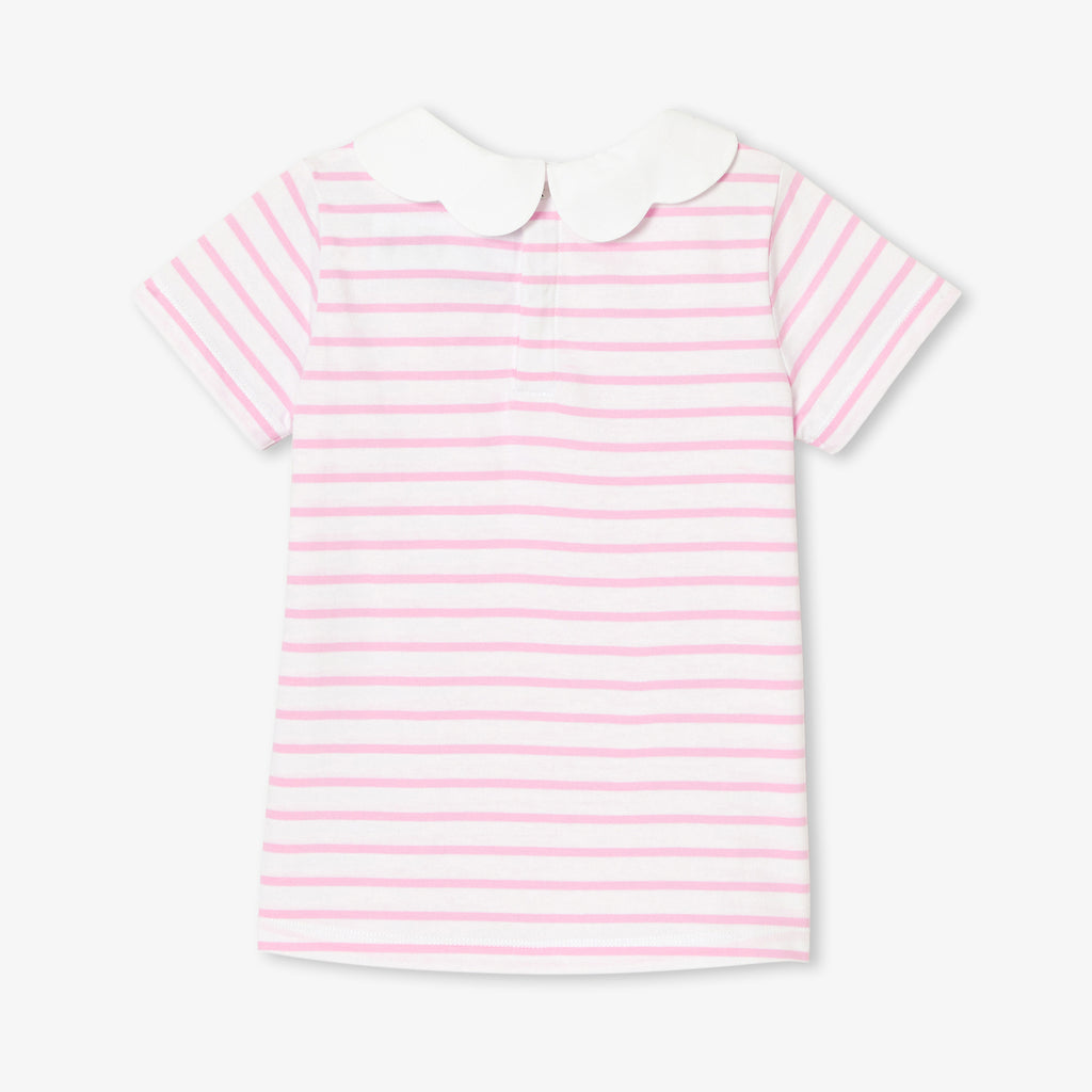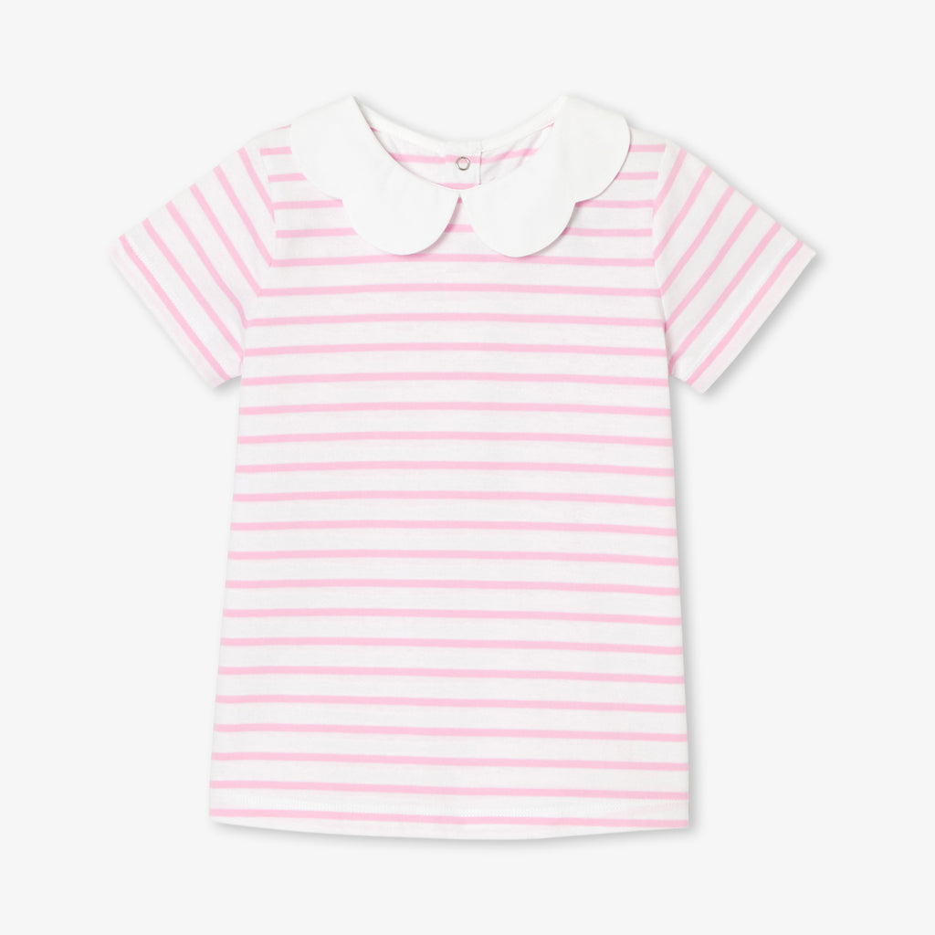 春らしいカジュアルシックなTシャツ。細めのストライプをあしらったセーラースタイルの一枚で、ポプリンのスカラップ襟がパリシックな雰囲気を演出しています。デイリーユースしやすく、春夏には、ワイドジーンズやプリーツスカートを合わせるのがおすすめ。