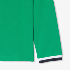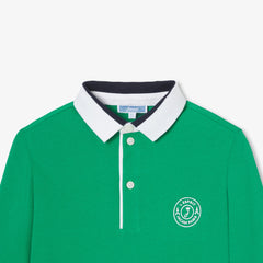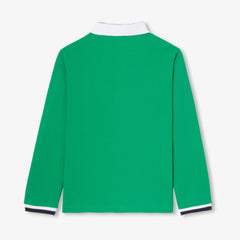 英国スクールスタイルのラガーポロシャツ。デイリーウェアの定番です。柔らかくしなやかなコットンピケを使用。大胆な色使いのストライプのリブ襟と袖口は、ジーンズやスウェットパンツにぴったり。通園・通学にも、お休みの日にも使えるマストアイテム。