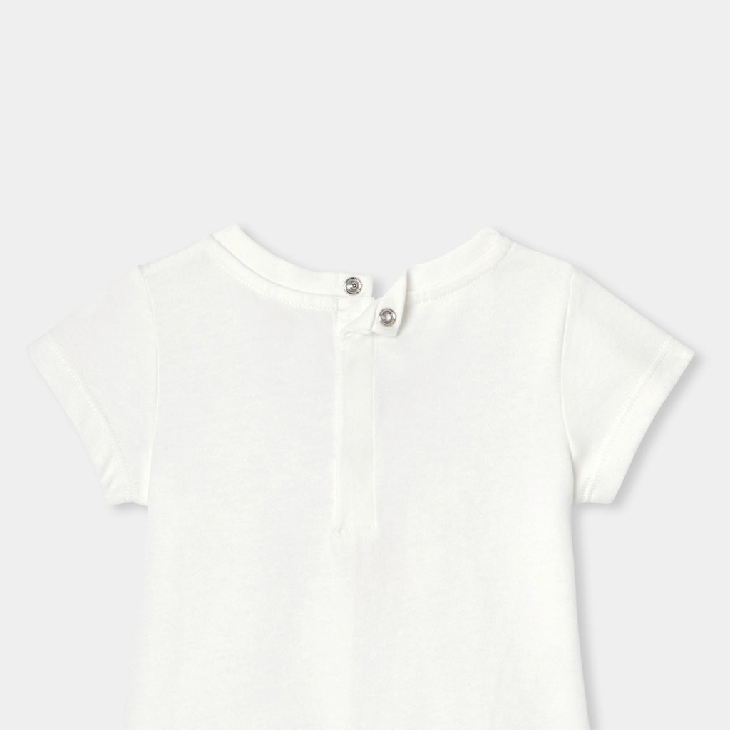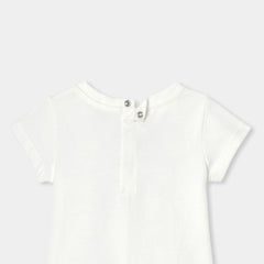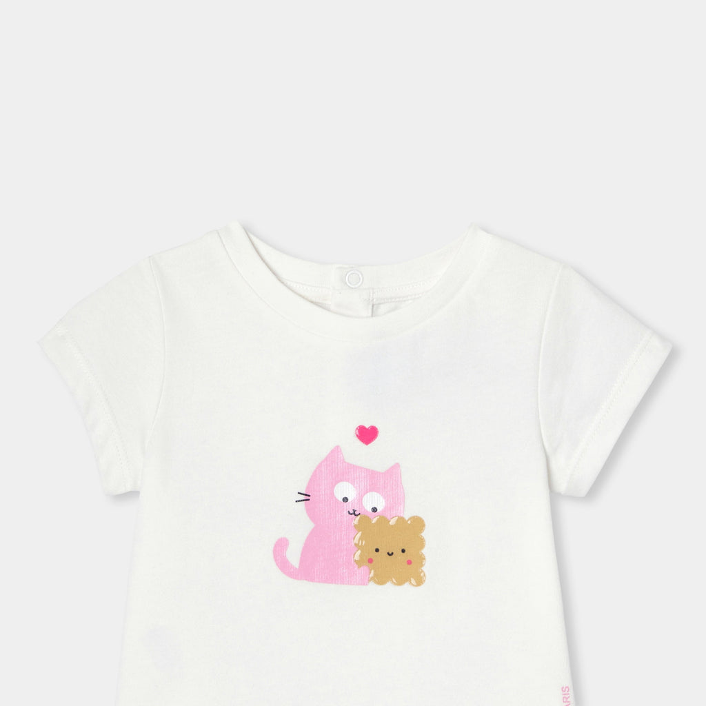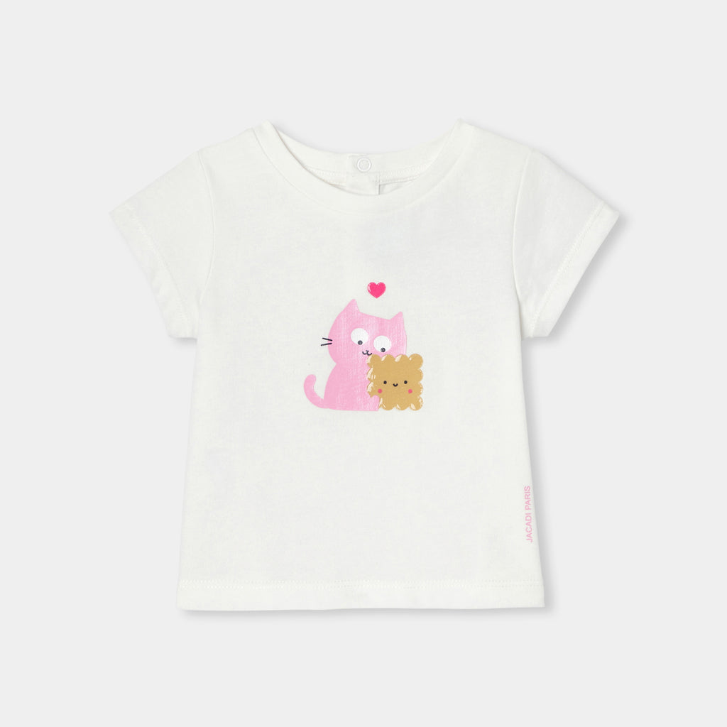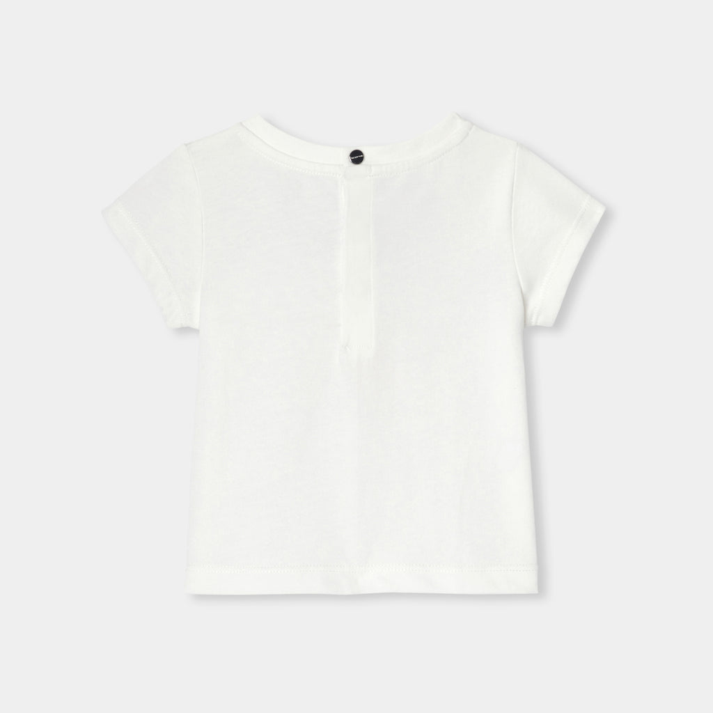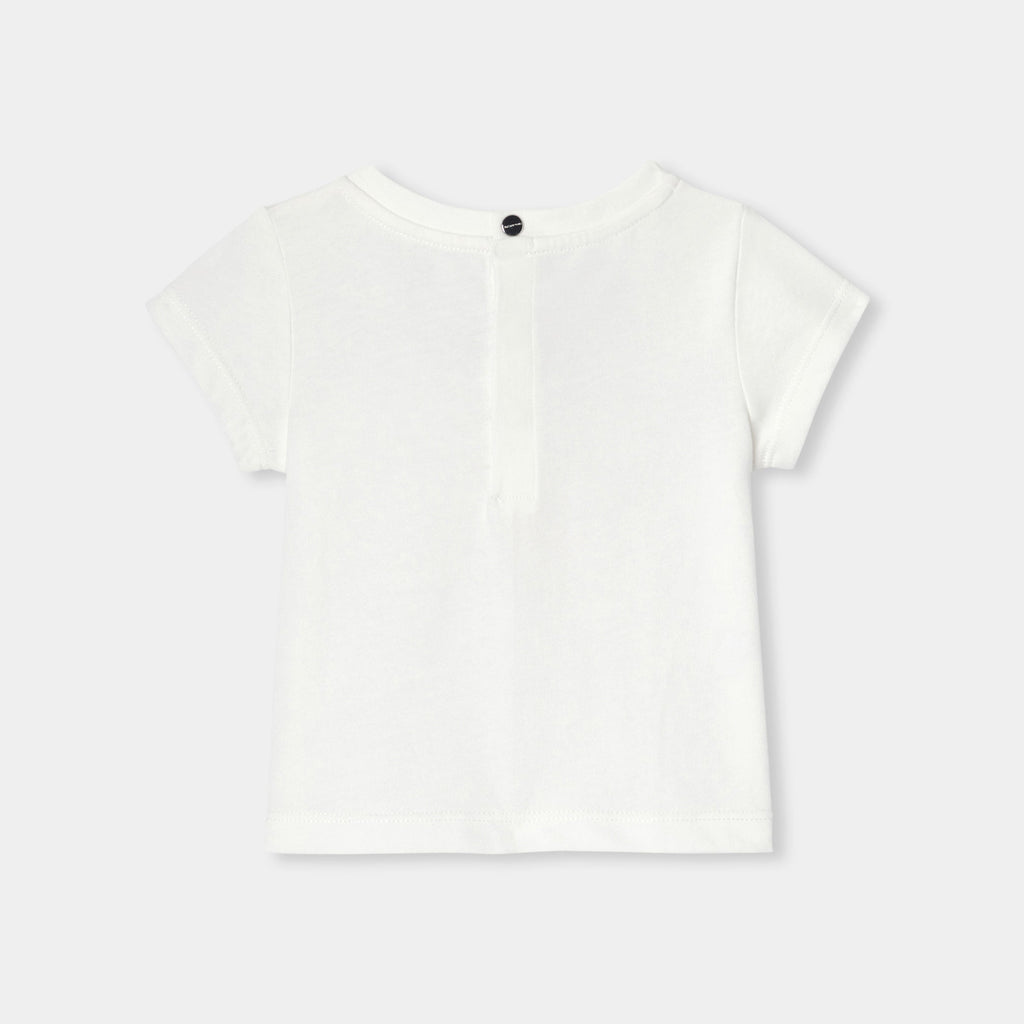 快適で着回し抜群。定番Tシャツは、どんな場面にも最適です。前面には、小さなお子さまが喜ぶこと間違いなしの、遊び心のある光沢プリントを施しました。背面のスナップボタンで着脱も簡単。ジーンズやショートパンツと合わせて、夏の終わりから着られます。