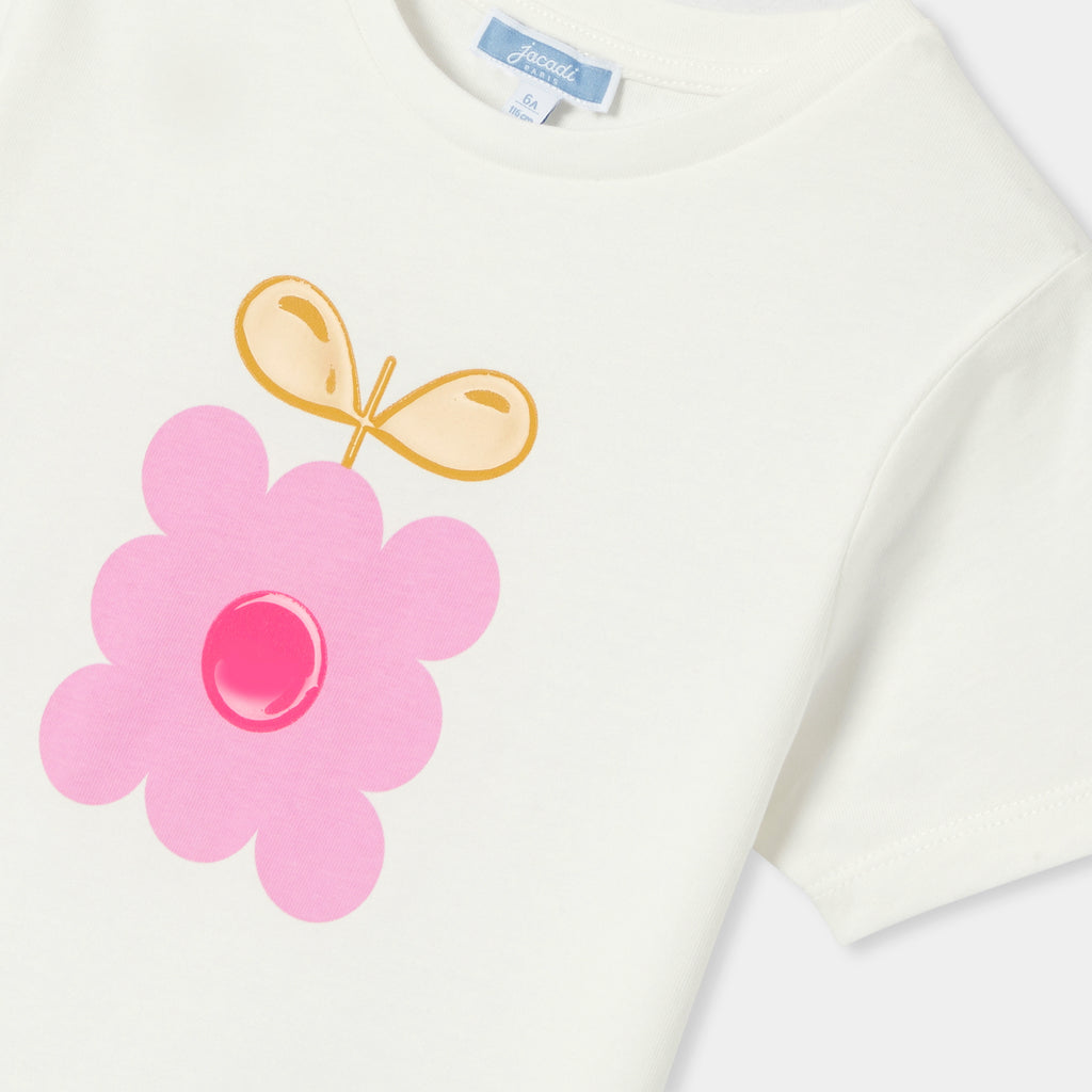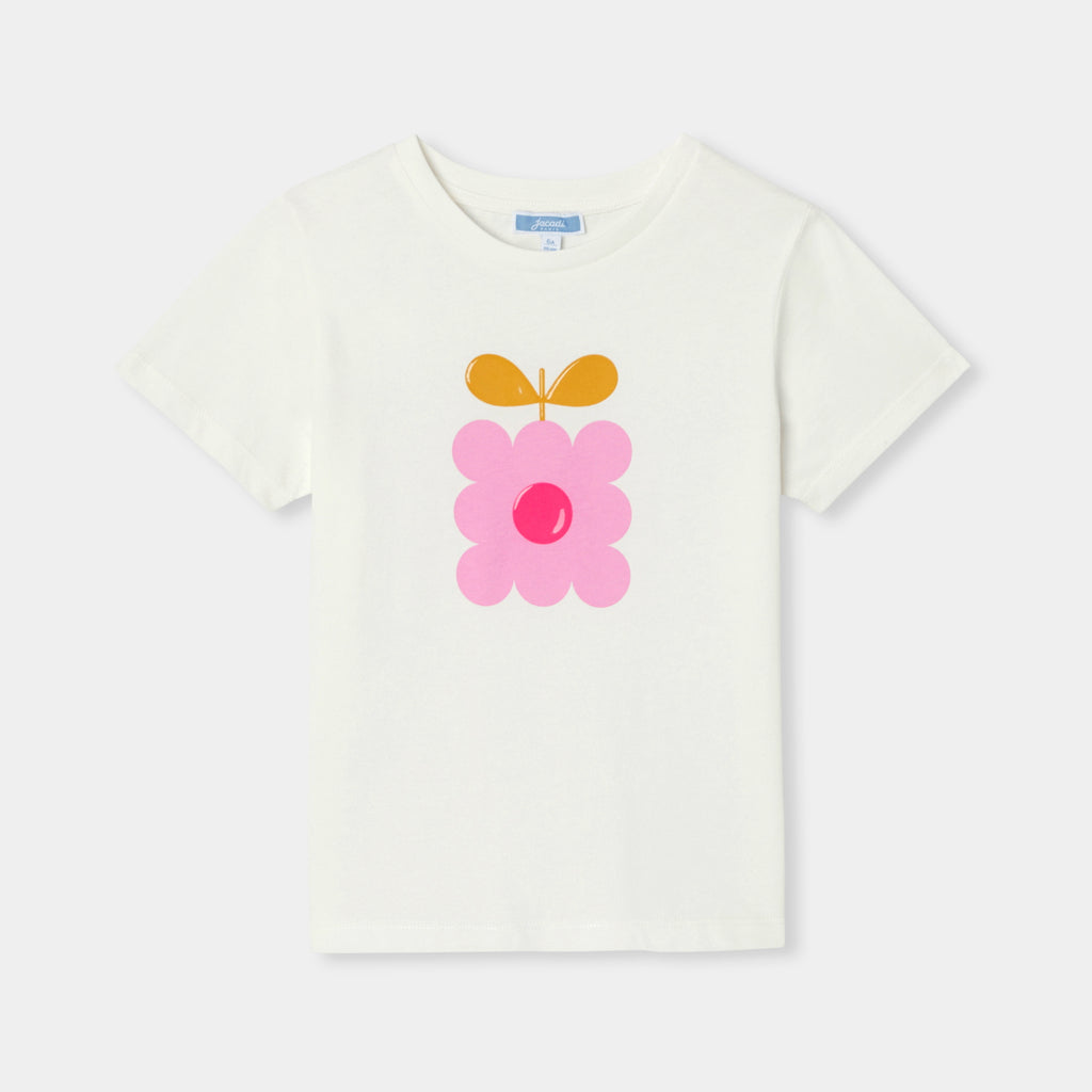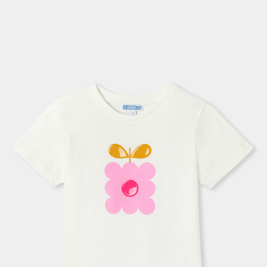 通園・通学にぴったりな、レトロシックでカラフルなTシャツ。70年代風の光沢のある花柄をあしらった、デイリーユースの定番です。キュロットスカートやワイドパンツに合わせて。
