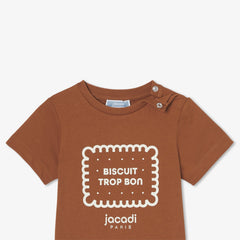 子ども時代の楽しい思い出を呼び覚ます、クッキーのモチーフが優しいユーモアを演出するTシャツ。柔らかなコットン製。肩のスナップボタンで着脱も簡単。ツイル地のパンツやジーンズに合わせて。