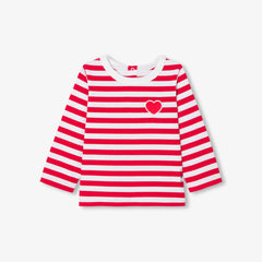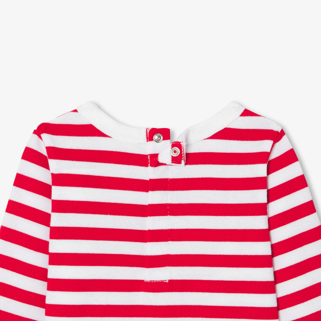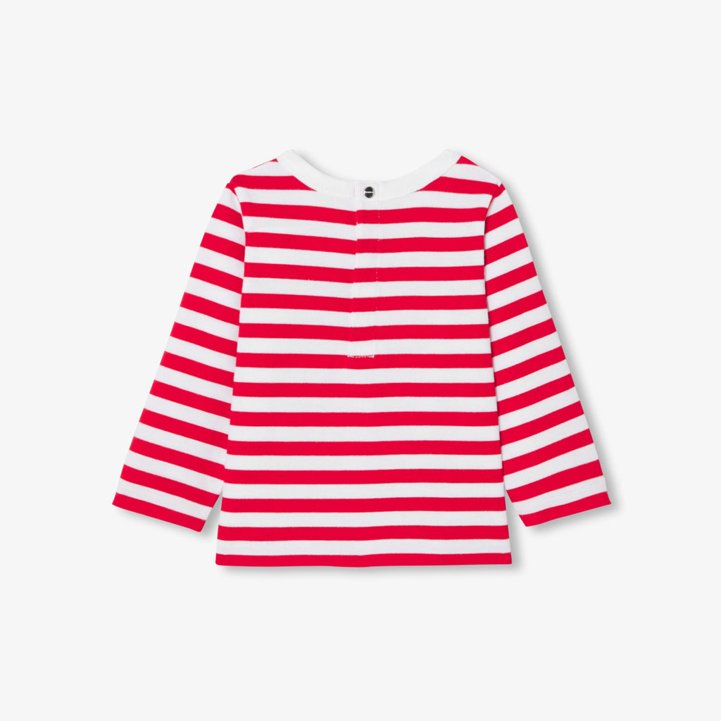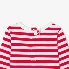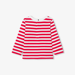 時代を超えて愛されるセーラーストライプTシャツが、新しい季節に向けて厚手のジャージー素材に生まれ変わりました。背面のスナップボタン、胸元の刺しゅうバッジ、白い襟がクラシックな一着です。ジーンズとメリージェーンに合わせれば、パリのエッセンス漂う、デイリーな装いが完成します。