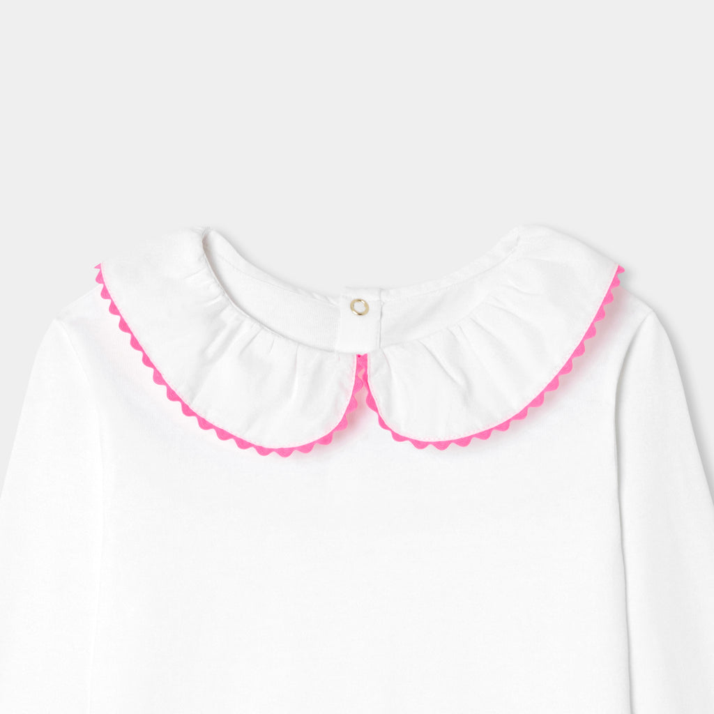 可愛らしいポプリンの襟にコントラストの効いたリックラックリボンをあしらった、シックな長袖Tシャツ。オーガニックコットンを使用した、デイリーに着られる定番アイテムです。ショートパンツとセーターに合わせれば、パリらしいシルエットに。