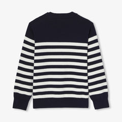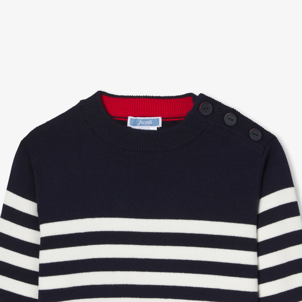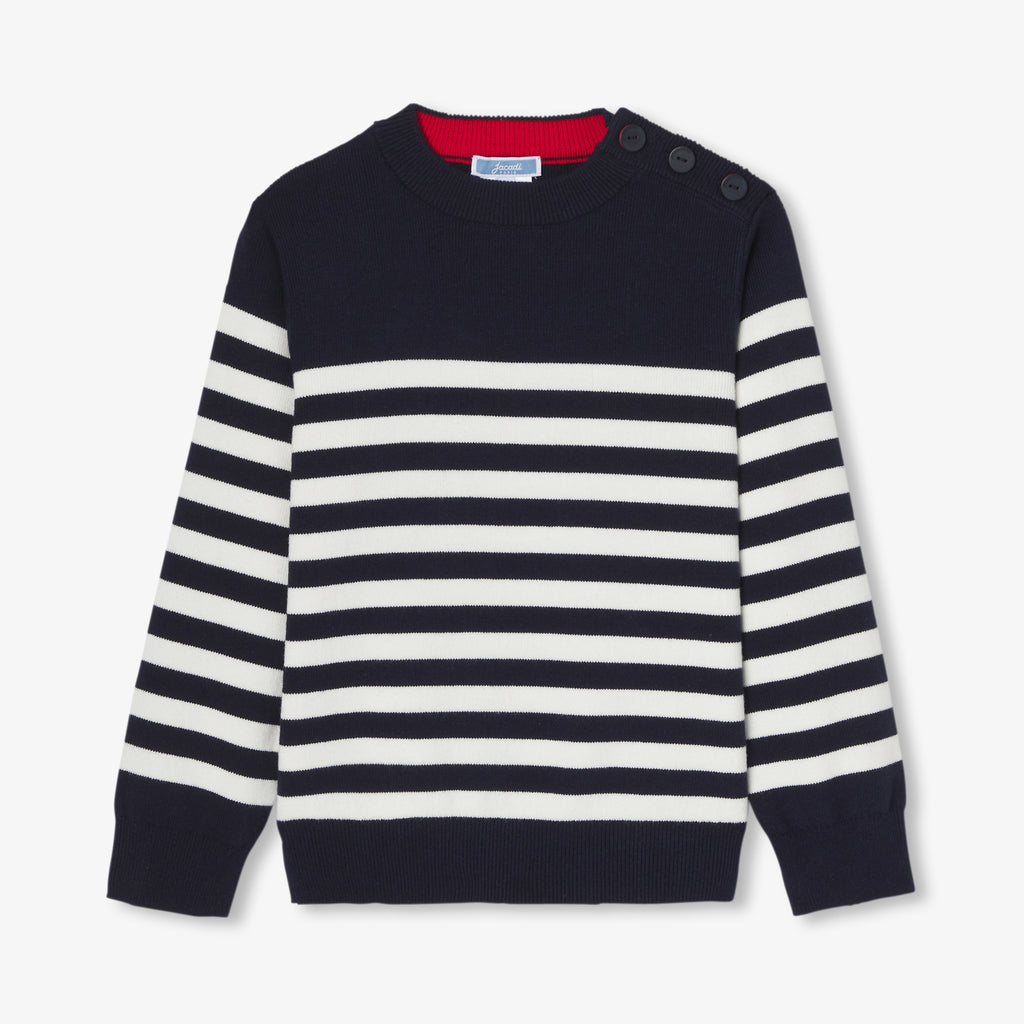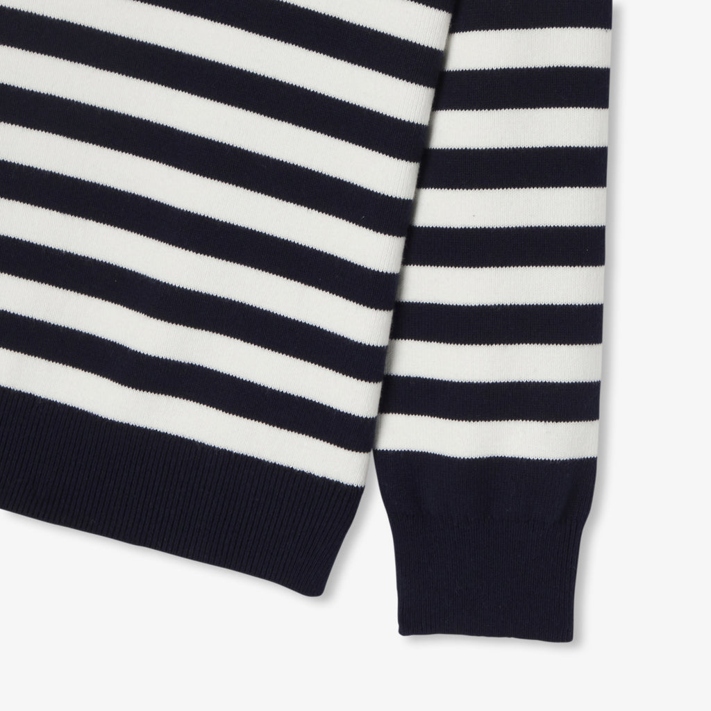 細部までこだわった丁寧な仕上げが光るセーラーセーター。きめ細かなニットと柔らかな肌ざわりで、一段とエレガントな雰囲気を演出します。ストライプと肩のボタン式プラケットなど、セーラーセーターのモダンなコードを取り入れました。ロールアップジーンズとスニーカーに合わせれば、シックなパリ風カジュアルのシルエットに。