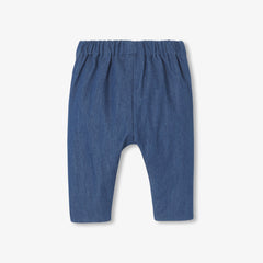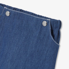 クラシックなカットを、ウエスト幅を調整できるデザインにアレンジしたジーンズ。赤ちゃんの体型に合わせたシルエットが特徴です。しなやかで軽いデニム素材に、ニットの裏地を施し、快適さと動きやすさを両立しました。