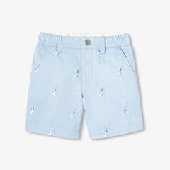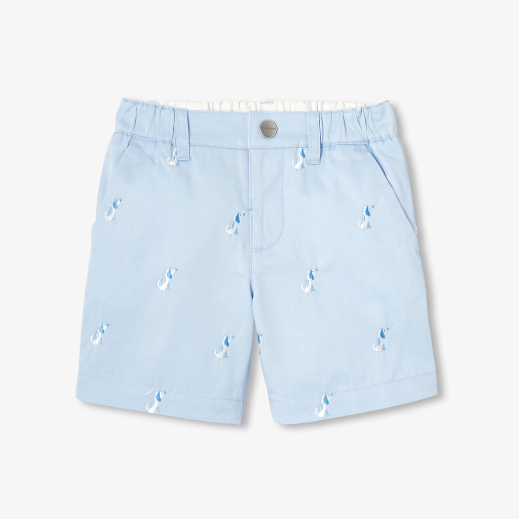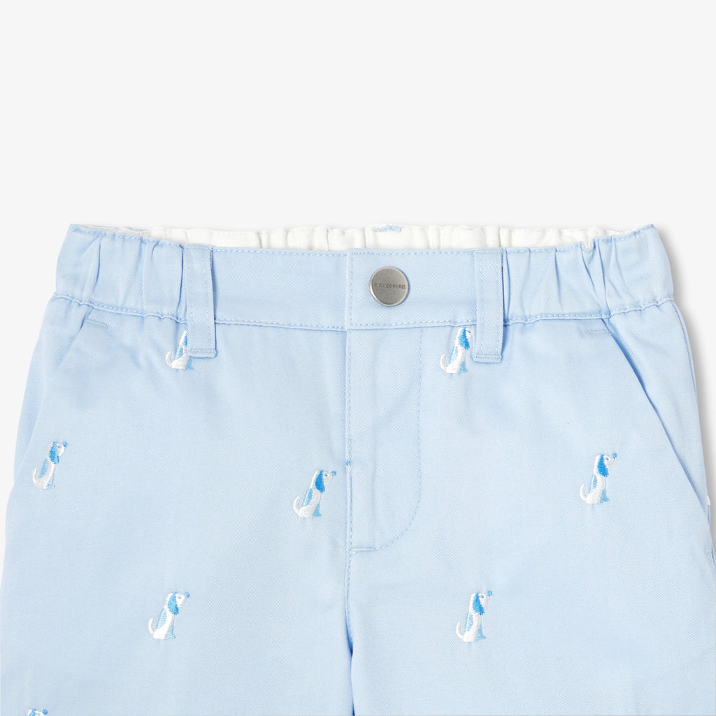 プレッピーなワードローブの定番として活躍するツイルショートパンツに小さな犬の刺しゅうをあしらい、遊び心のあるデザインを加えました。柔らかく着脱も簡単で、ポロシャツやTシャツともよく合います。ホリデーシーズンのコーディネートにも取り入れたい一本です。