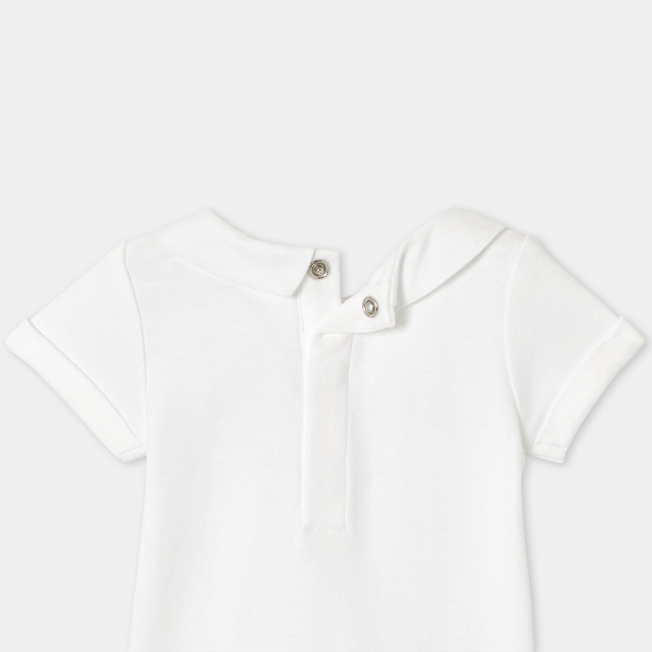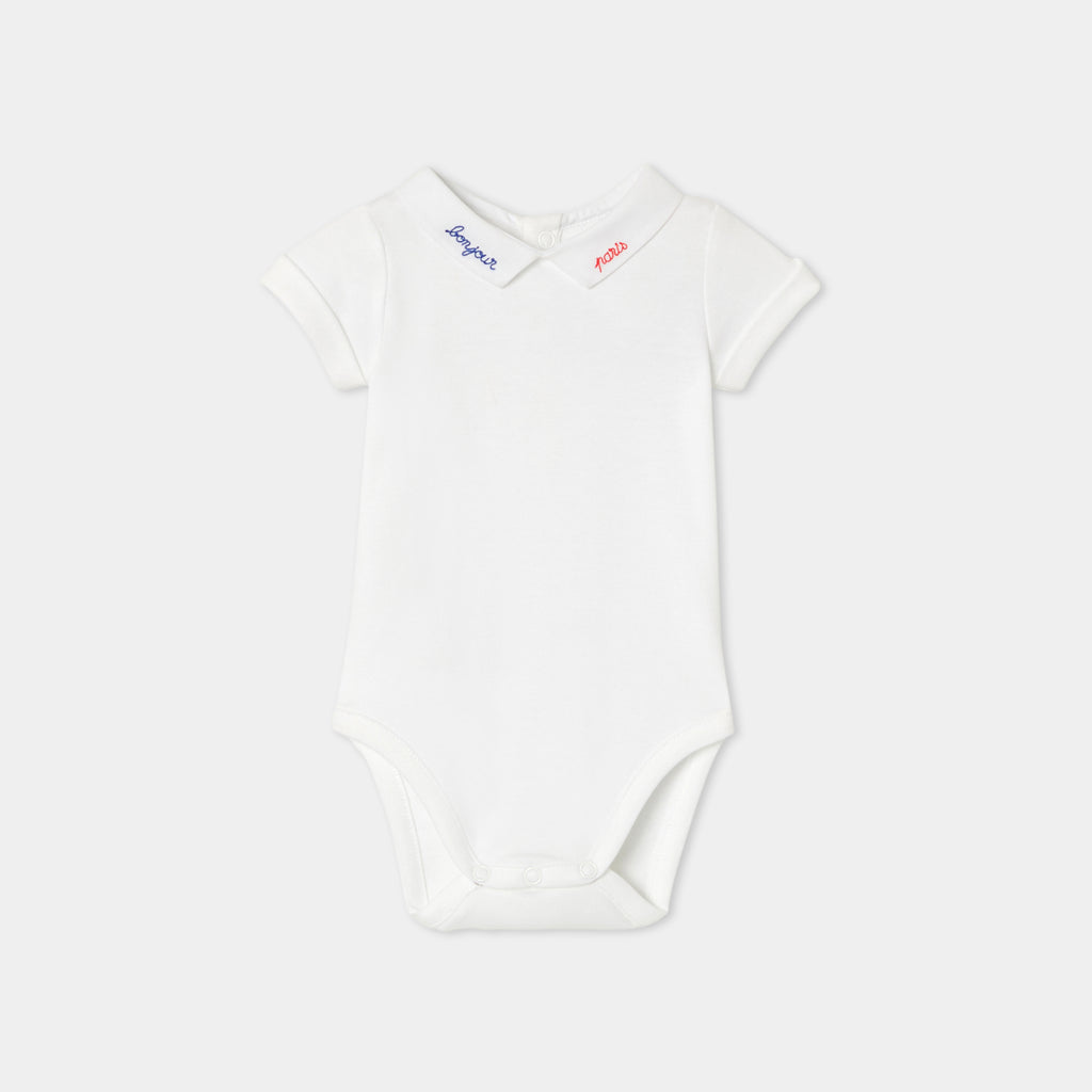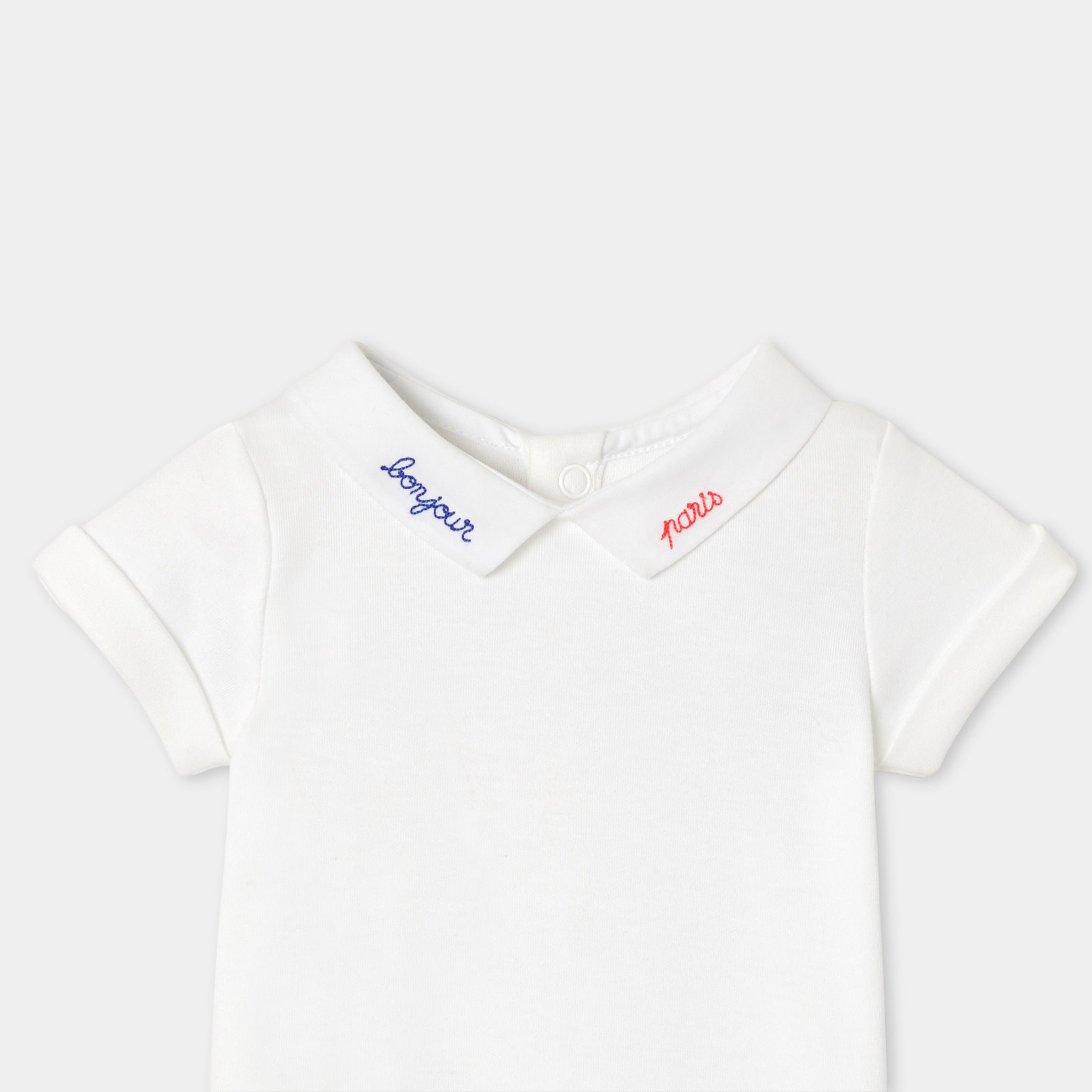 "Bonjour Paris" の刺しゅうを施したポプリン襟がアクセント。ギンガムチェックのサロペットや着心地の良いジーンズにもよく合います。