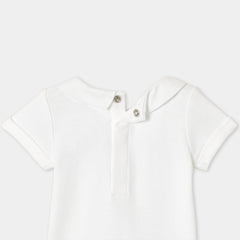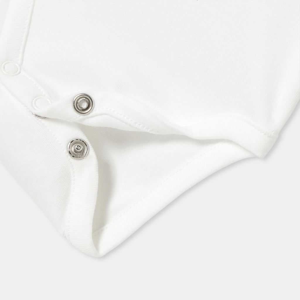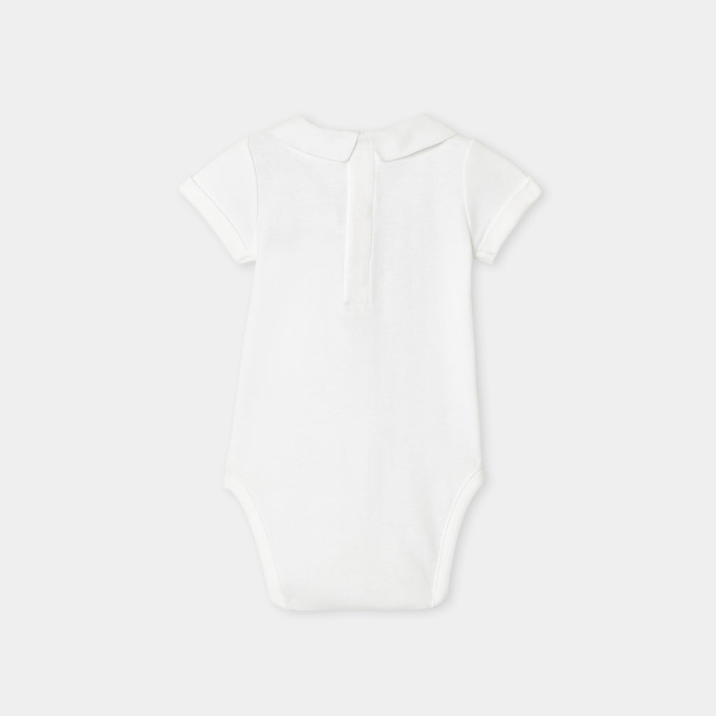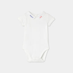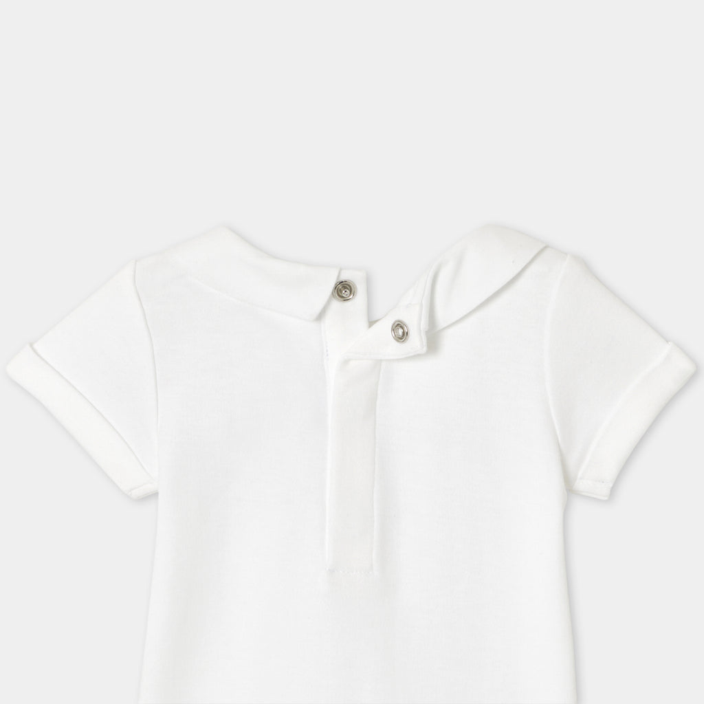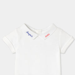 "Bonjour Paris" の刺しゅうを施したポプリン襟がアクセント。ギンガムチェックのサロペットや着心地の良いジーンズにもよく合います。