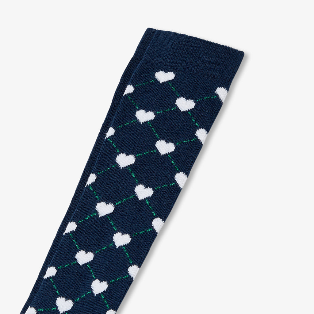 プレッピースタイルに遊び心を加えたソックス2足セット。アイレットレースのハートモチーフのソックスと、幾何学模様のダイヤモンドとタッセルをあしらったソックスを組み合わせました。プリーツスカートとローファーに合わせて、スクールルック風に。