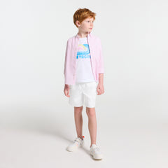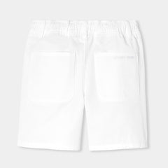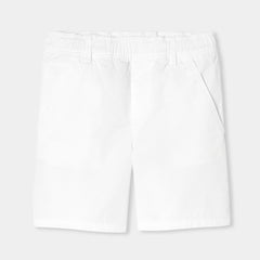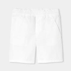 ストレートカットを施したホワイトの夏向けバミューダショートパンツ。紙のような質感のコットンツイル素材を使用しており、伸縮性ウエストゴム入りで履きやすく、暑い時期の着こなしに要注意です。バカンスでぴったり、Tシャツやポロシャツを合わせてみてください。