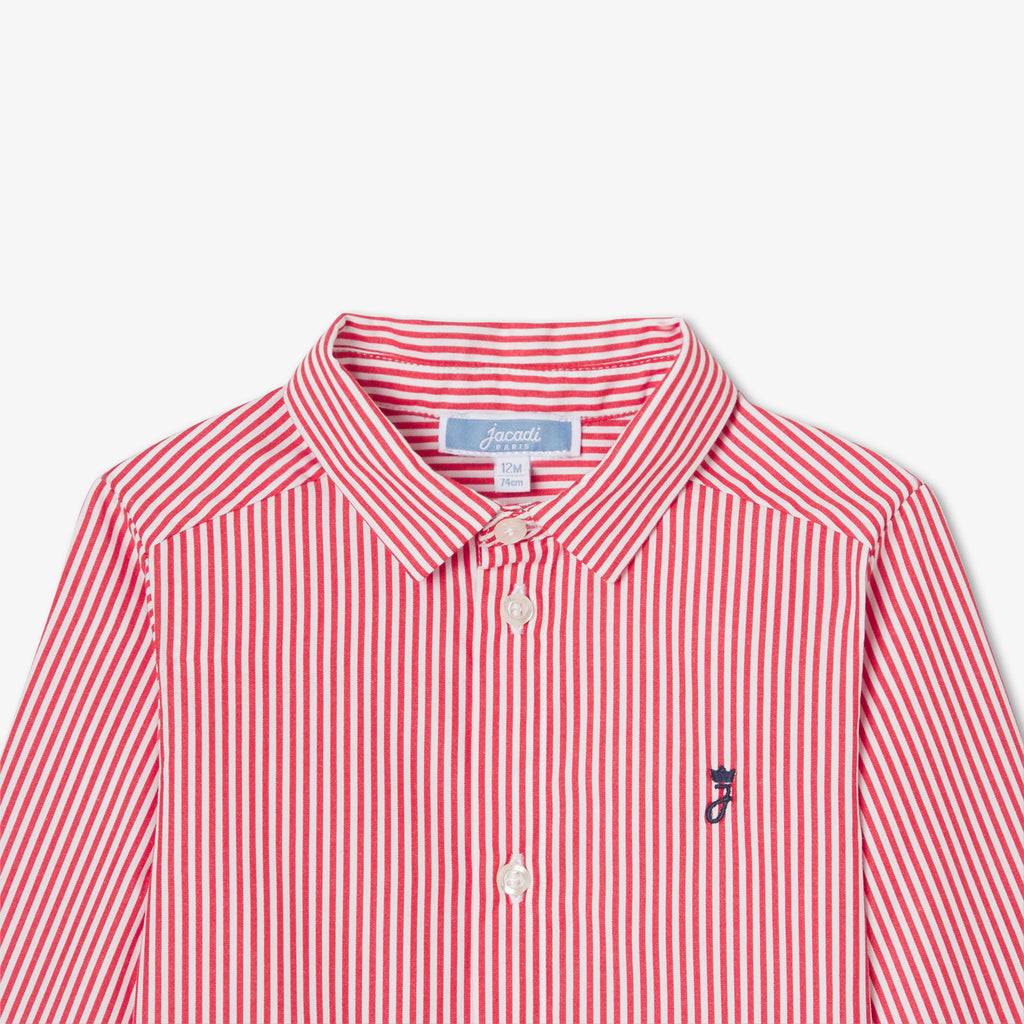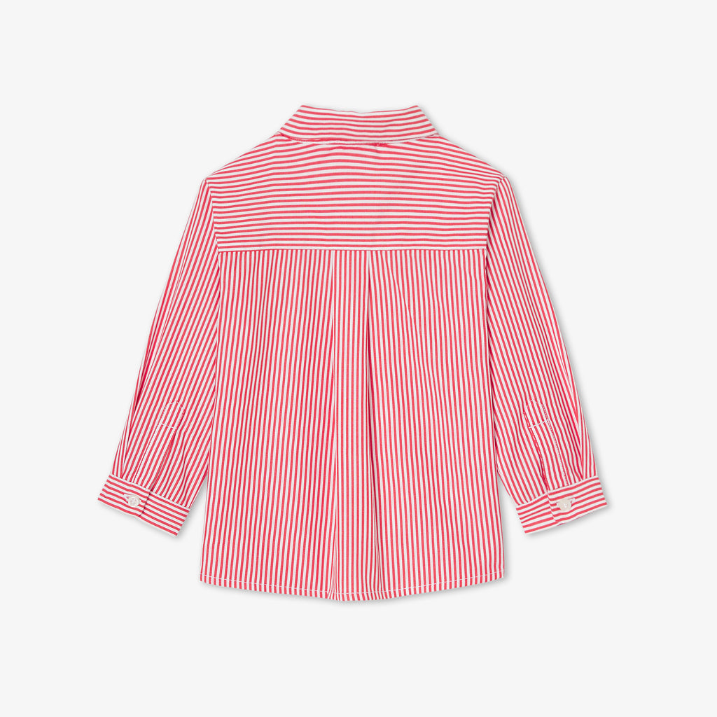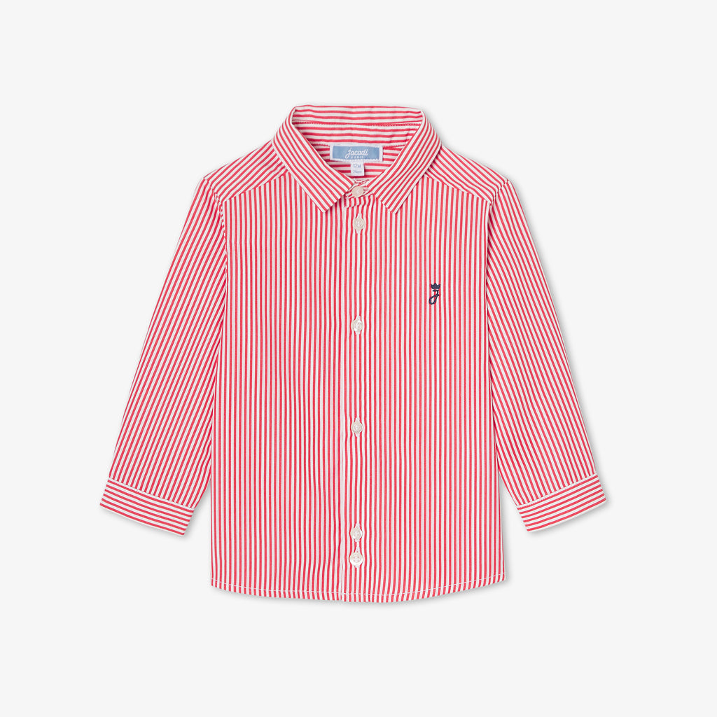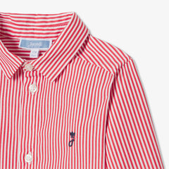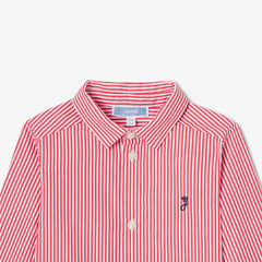 通園に大活躍する、シックな万能シャツ。ストライプ柄のオーガニックコットンポプリンを使用し、胸元にあしらった"J"の刺しゅうロゴが特徴の一着。特別な日の装いにはベロア調生地のパンツを合わせて。ボディスーツの上に羽織ってジーンズと合わせれば都会的なシルエットに。