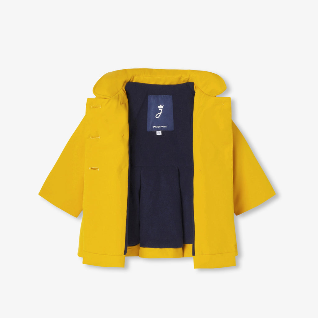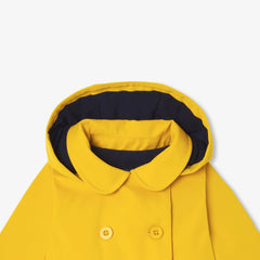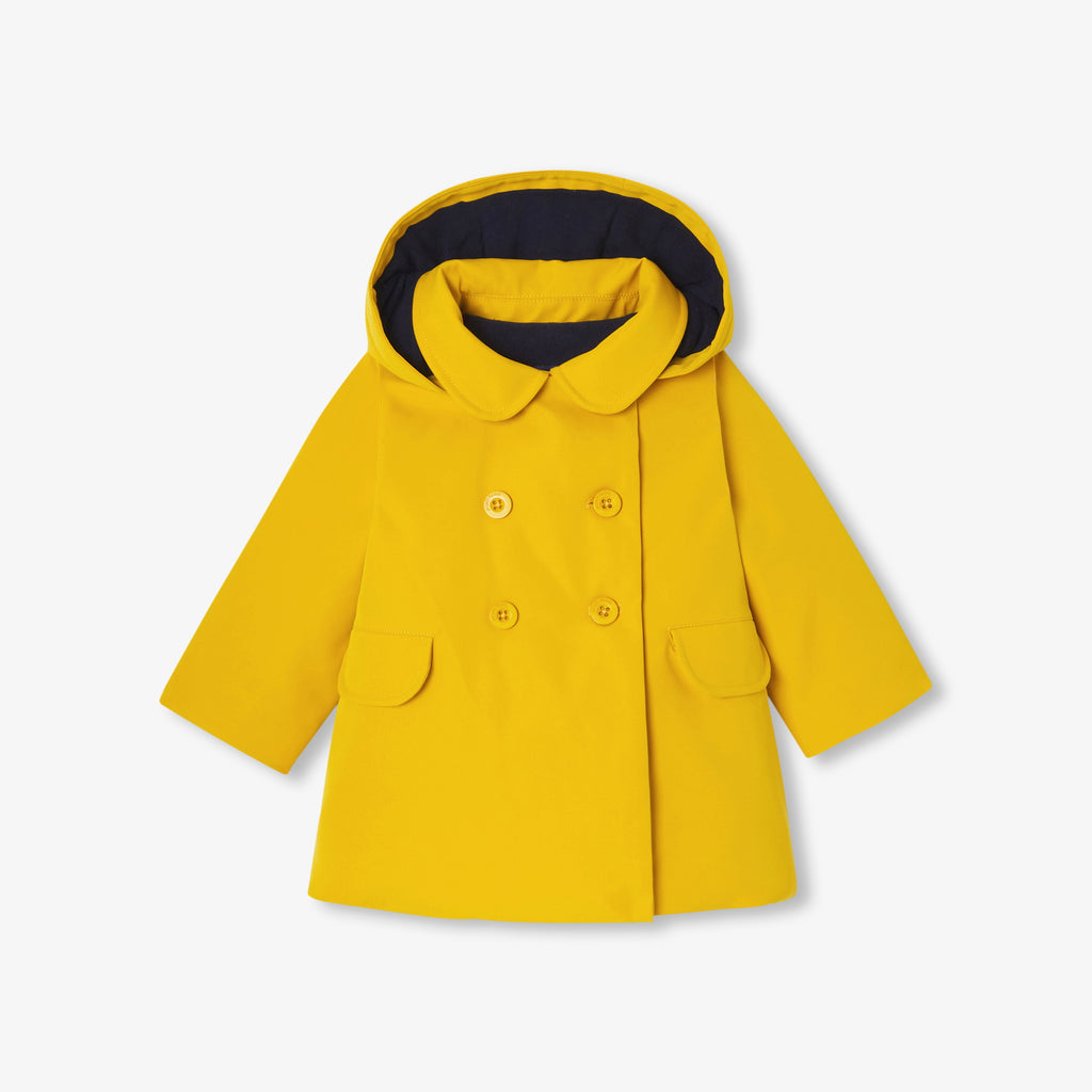 シックな英国風コートをイメージしたレインコート。エレガンスと保護機能を兼ね備えています。ピーターパンカラー(襟)、フラップポケット、ボックスプリーツ、背面のハーフベルトがおしゃれ。今シーズンの必需品です。コントラストの効いた裏地が特徴で、取り外し可能なフード付き。にわか雨を防ぐのに最適で、普段着としても着用できます。外出時にお子さまを守ってくれる一着です。