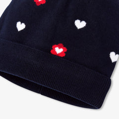 ネイビーブルーのコットンに赤い花と白いハートをあしらった帽子。フレンチテイスト漂う、シックな冬の装いに。裏地はマイクロフリースで、ポンポン付き。お揃いのスヌード(別売り)との相性は抜群です。頭を暖かく守り、季節感を演出します。